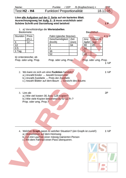 Name: Test H2 H4 Punkte: 22P /5 (Kopfrechnen) Funktion/ Proportionalität /27P 18.11.05 Löse alle Aufgaben auf der 2. Seite auf ein kariertes Blatt. Ausrechnungsweg bei Aufg. 5 8 muss ersichtlich sein! Schöne Schrift und Darstellung wird belohnt! 1. a) Vervollständige die Wertetabellen. Bootsmiete: Stunden Preis (Fr.) 1 12.12 0.5 1 Tag b) Unterstreiche; ob Prop. oder umg. Prop. Fahrt (gleiche Strecke): Geschwindigkeit Zeit (Km/h) (min) 3 64 1 16 52 Prop. oder umg. Prop. 1P Bauernhof: 4P Anz. Gewicht Äpfel (kg) 80 20 16 3 48 Prop. oder umg. Prop. 1 P 2. Wo kann es sich um eine Funktion handeln? a.) Anzahl Kinder Anzahl Grossmütter b.) Anzahl Zwiebeln Preis der Zwiebeln c.) Anzahl Blätter auf dem Baum Gewicht des Baums 1 P 3. Lies ab: a.) Wie viel kosten 30, bzw. 128 Kopien? b.) Wie viele Kopien bekommst du für 12 Fr.? Prop. oder umg. Prop.? 2P 4. Welcher Graph passt zu welcher Situation? (ein Graph ist zuviel!) a.) Betrunkener auf dem Heimweg b.) 12-min Lauf bei einer mässig trainierten Person c.) Mit dem Fahrrad einen Pass überqueren. 1 P 5. 1 Euro kostet 1.50 Fr 4P a.) Zeichne eine Wertetabelle mit 4 weiteren Werten (3, 4.5, 7, 13 Euro). b.) Zeichne ein Pfeildiagramm dazu. c.) Zeichne den Funktionsgraphen dazu. 6. Ein Auto fährt mit einer Tankfüllung vom 28 Liter 450 km weit. a.) Wie weit kommt es mit einem Liter? b.) Wie viel Benzin verbraucht es auf 100 km? c.) Prop. oder umg. Prop.? 2 P 7. Eine Abfahrtsstrecke für Skirennfahrer ist 5.6 km lang. 2P Wie viele Streckenposten (Fahnen) sind nötig, wenn der Abstand zwischen zwei Streckenposten 50m (80m) betragen soll? 8. 2 Personen brauchen für eine Arbeit auf der Baustelle 18 Stunden. Wie lange brauchen 9 Leute für die gleiche Arbeit? Prop. oder umg. Prop.? Kopfrechnen B: Halte dein Gehirn fit!!! • • • • 1 P Name: Schreibe nur 2 Zwischenresultate pro Rechnung auf! Wähle von 6 Aufgaben fünf aus! 1 Aufgabe ist ein Punkt wert. Unterstreiche das Endergebnis! Schreibe nur mit Fülli oder Kugelschreiber! 1. 10,5 15 2. 2 1/5 0.7 m2 3. 4 – 16 34 Min. 220 m2 3d 7h 26 min. 4. 475 –276 5. Ein Fisch schwimmt in 10 Min. 250 m. Wie viel in 6 Min.? 6. Ein Knopf kostet 80 Rp. Wie viel kosten 4 Dutzend? 199 150 38.4Fr.
