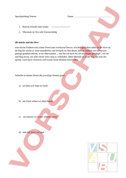 Sprachprüfung Nomen 1. Nomen schreibt man immer Name: ------------------------ 2. Übermale im Text alle Nomen farbig die mücke und der löwe eine mücke forderte einst einen löwen zum zweikampf heraus. mit hohngelächter nahm in der löwe an. da flog die mücke in seine nasenlöcher und zerstach sie ihm derart, dass er endlich von schmerzen geplagt gestehen musste, er sei überwunden. „ was bin ich doch für ein mächtiges geschöpf, rief sie und flog davon, um allen tieren ihren sieg zu verkünden. dabei übersah sie in der eile, das netz der spinne, ward darin verstrickt und musste einen elenden tod erleiden. Schreibe in diesen Sätzen das jeweilige Nomen gross: a) auf dem pult liegt ein buch. b) ein mann schaut aus dem fenster c) im sommer ist immer schönes wetter d) eine kuh frisst viel gras 3. Unterstreich mir die Nomen: dann springen dario mutter doch auf malen fuss davon etwas hans ecke 4. Setze den richtigen Artikel vor das Nomen: ----------------Bleistift -----------------Null -----------------Mais -----------------Koffer ----------------Kies ----------------Efeu ----------------Angel ----------------Kaffee ----------------Butter ----------------Tram ----------------Kino ----------------Spital