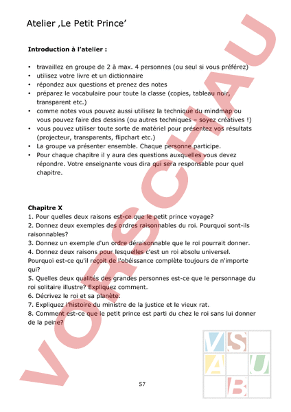 Atelier ‚Le Petit Prince Introduction à latelier • • • • • • • • travaillez en groupe de 2 à max. 4 personnes (ou seul si vous préférez) utilisez votre livre et un dictionnaire répondez aux questions et prenez des notes préparez le vocabulaire pour toute la classe (copies, tableau noir, transparent etc.) comme notes vous pouvez aussi utilisez la technique du mindmap ou vous pouvez faire des dessins (ou autres techniques – soyez créatives !) vous pouvez utiliser toute sorte de matériel pour présentez vos résultats (projecteur, transparents, flipchart etc.) La groupe va présenter ensemble. Chaque personne participe. Pour chaque chapitre il aura des questions auxquelles vous devez répondre. Votre enseignante vous dira qui sera responsable pour quel chapitre. Chapitre 1. Pour quelles deux raisons est-ce que le petit prince voyage? 2. Donnez deux exemples des ordres raisonnables du roi. Pourquoi sont-ils raisonnables? 3. Donnez un exemple dun ordre déraisonnable que le roi pourrait donner. 4. Donnez deux raisons pour lesquelles cest un roi absolu universel. Pourquoi est-ce quil reçoit de lobéissance complète toujours de nimporte qui? 5. Quelles deux qualités des grandes personnes est-ce que le personnage du roi solitaire illustre? Expliquez comment. 6. Décrivez le roi et sa planète. 7. Expliquez lhistoire du ministre de la justice et le vieux rat. 8. Comment est-ce que le petit prince est parti du chez le roi sans lui donner de la peine? 57 Chapitre XI 1. Que représentent les autres pour un vaniteux? 2. Pourquoi le vaniteux porte-t-il ce chapeau drôle? 3. Décrivez le jeu que font le vaniteux et le petit prince. 4. Quest-ce que le petit prince veut faire pour changer le jeu? 5. Que signifie admirer? 6. Pourquoi larrivée du petit prince plaît-il au vaniteux? 7. Quest-ce que le petit prince ne comprend pas? 8. Continuons le portrait dune grande personne. Quelle(s) qualité(s) bizarre(s) chez les adultes est-ce que les mots et les actions du vaniteux montrent? Chapitre XII 1. Expliquez le cercle vicieux du buveur. 2. Désirait-il causer de sa condition? Pourquoi ou pourquoi pas? 3. Quelle(s) qualité(s) bizarre(s) chez les grandes personnes est-ce que ce rendez-vous avec le buveur illustre? 4. Pourquoi le petit prince sen fut perplexe de cette planète? Chapitre XIII 1. Pourquoi est-ce que le businessman naccueille pas le petit prince? 2. Racontez lhistoire des deux fois quil été interrompu. 3. Décrivez une étoile daprès le businessman. 4. Quels adjectifs est-ce que le businessman utilise pour se décrire? 5. Expliquez la différence entre régner et posséder. 6. Daprès le businessman, comment peut-on posséder les étoiles? 7. quoi sert-il dêtre riche? 8. Comment le petit prince est-il utile à ses possessions? 9. Comment le petit prince explique-t-il que posséder les étoiles nest pas sérieux? 58 Chapitre XIV 1. Quest-ce que cest quun géographe? 2. Chacun des habitants des petites planètes que visite le petit prince, se croit très important. En quoi le travail du géographe est-il important? 3. Expliquez la différence entre un géographe et un explorateur. 4. Quelles qualités sont essentielles chez un explorateur? Pourquoi? 5. Quest-ce qui signifie éphémère? 6. Pourquoi le petit prince a-t-il un regret? Chapitre XVI 1 Pourquoi est-ce que Saint-Exupéry décrit la Terre en employant beaucoup de chiffres? 2. Faites une liste des chiffres dans ce chapitre avec les objets comptés. Ecrivez les chiffres en numéros, pas lettres. 3. Qui, comme il indiqué dans un chapitre précédant, est impressionné par les chiffres? 3. Faites une liste des pays et des continents en ordre dans le ballet des allumeurs. 4. Quelles postes dallumeur de réverbère est-ce que lhomme du cinquième planète aimerait entreprendre? Expliquez pourquoi. Chapitre XVII 1 Pourquoi est-ce que Saint-Exupéry sexcuse au début de ce chapitre? 2. Il avait des milliards dhommes sur la Terre en 1946. Comment se fait-il quon peut être seul aussi chez les hommes? 3. Avez-vous très bien compris la puissance du serpent? Comment peut-il lemporter plus loin quun navire? Expliquez en vos mots. Chapitre XVIII 1. La fleur décrit les hommes dune drôle de manière. Prenez les images de cette description et expliquez pourquoi elles lui semblent logiques. 2. Pourquoi est-ce que cette fleur croit que seulement quelques hommes existent? 59 Chapitre XIX 1. Où est-ce que le petit prince est monté? 2. Quest-ce quil fait là-haut? 3. En quoi cette scène est-elle triste? thème: Est-ce que les hommes manquent dimagination? Est-ce quils ressemble aux moutons qui suivent docilement leur chef? Où voyez-vous la mentalité du troupeau dans la vie? Quand vaut-il mieux suivre sans trop réfléchir? Chapitre XX 1. Quest-ce qui mène vers les hommes? 2. quoi est-ce que ces roses ressemblent? 3. Comment réagirait sa fleur à les voir, ces cinq milles roses toutes semblables? 4.Pourquoi le petit prince pleure-t-il? Chapitre XXI 1. Normalement on trouve le renard un des personnages le plus sympa. Pourquoi le trouve-t-on sympa? De quoi est-ce quil est le symbole? 2. Pourquoi est-ce que le renard ne pouvait pas jouer avec lui? 3. Que veut dire apprivoiser? Essayez de lexpliquer en français, pas seulement de traduire le mot en anglais. 4. Comment le petit prince change-t-il sa réponse à la questions à propos de ce quil cherche? 5. Décrivez trois effets dans la vie du renard si le petit prince lapprivoise. 6. Décrivez les hommes du point du vue du renard. Pourquoi cest rigolo? 7. En quoi la planète du petit prince plaît-elle au renard? 8. Pourquoi est-ce que les hommes nont plus d amis? 9. .Expliquez comment se comporter pour apprivoiser le renard. 10. Qui déjà apprivoisé le petit prince? 11. Pourquoi faut-il des rites? 12. Expliquez la différence entre les roses au jardin et celle du petit prince. Ici en Australie, on méprise les renards. On les considère de vilains animaux, des peste