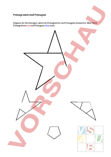 Pentagramm und Pentagon Ergänze die Zeichnungen, damit du Pentagramme und Pentagone bekommst. Bitte fahre Pentagramme rot und Pentagone blau nach.