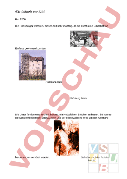 Die Schweiz vor 1291 Um 1200: Die Habsburger waren zu dieser Zeit sehr mächtig, da sie durch eine Erbschaft an Einfluss gewinnen konnten. Habsburg heute Habsburg früher Die Urner fanden eine Technik heraus, mit Holzpfählen Brücken zu bauen. So konnte die Schöllenenschlucht überwunden und der beschwerliche Weg um den Gotthard herum enorm verkürzt werden. Geissbock auf der Teufelsbrücke Für das deutsche Reich war dieser Weg nach Italien sehr wichtig, da Teile von Norditalien in ihren Händen waren. Uri gewann durch diese Erfindung an Bedeutung und konnte von nun an allen, die die Schöllenenbrücke überqueren wollten, einen Wegzoll abknöpfen. Sie befürchteten, genauso wie der deutsche König, dass die machthungrigen Habsburger Uri für sich beanspruchen wollten. Deshalb stellte der deutsche König Uri direkt unter seinen Schutz. Auch die Schwyzer erhielten vom deutschen König die Reichsunmittelbarkeit und unterstützten ihn dafür später auf dem Gotthardpass im Kampf gegen die päpstlichen Truppen. Die Grafen von Habsburg wollten den deutschen Königsthron. Dies gelang ihnen auch. Nach einer Schlacht in Österreich wurde Rudolf von Habsburg König von Österreich und deutscher König. Als er 1291 starb, vereinten sich die drei Waldstätten (Uri, Schwyz und Unterwalden) und schlossen einen Bund. Das Ziel war nicht, sich vom deutschen Reich loszulösen (also unabhängig zu sein), sondern ihr Widerstand richtete sich gegen die habsburgischen Vögte, die in machthaberischer Art über das Volk bestimmten.