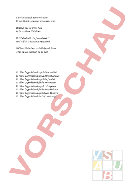 En Wichtel lauft durs hoche Gras Er suecht sich – niemmer weiss rächt was. Plötzlich mit me grosse Satz Stoht vor ihm bösi Chatz De Wichtel seid: „So friss mi doch! Und schlüft is nächschte Muuseloch DChatz bliebt dusse und dänkt voll Wuet: „Chlii sii wär mängisch au no guet. 10 chlini Zappelmännli zappled hin und här 10 chlini Zappelmännli findet das nöd schwär 10 chlini Zappelmännli zappled uf und ab 10 chlini Zappelmännli findet das no glatt 10 chlini Zappelmännli zapplet z‘ringelum 10 chlini Zappelmännli findet das nöd dumm 10 chlini Zappelmännli spieled gern Versteck 10 chlini Zappelmännli sind uf zmol weg!