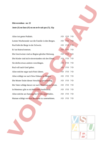 Hörverstehen nr. 22 Juste (J) ou faux (F) ou on ne le sait pas (?), 15p Aline isst gerne Pralinés. JO FO ?O Letztes Wochenende war die Familie in den Bergen. JO FO ?O Paul liebt die Berge in der Schweiz. JO FO ?O Er hat Knieschmerzen. JO FO ?O Die Geschwister sind zu Beginn gleicher Meinung. JO FO ?O Die Kinder sind nicht einverstanden mit den Eltern. JO FO ?O Sie dürfen etwas anderes vorschlagen. JO FO ?O Paul will nach Genf gehen. JO FO ?O Aline möchte sogar nach Paris fahren. JO FO ?O Aline schlägt vor nach New Orleans zu fliegen. JO FO ?O Die Mutter findet diesen Vorschlag unvernünftig. JO FO ?O Der Vater schlägt darum vor nach Montreux zu fahren. JO FO ?O In Montreux gibt es ein bekanntes Jazzfestival. JO FO ?O Aline möchte am Samstag bis 11 Uhr ausschlafen. JO FO ?O Maman schlägt vor eine Bootstour zu unternehmen. JO FO ?O Textverstehen: Que faites – vous de votre temps libre? Lies den Text und fülle die Lücken aus. 9p Stéphanie aime à la avec ses . Isa joue et elle aime. Guillaume regarde des films au ou à la . Vincent joue trompette, il été au championnat suisse. Eric joue dans une . Arnaud veut rester svelte, alors, il joue deux par semaine. Maité invente des auxquels elle peut seule. Elodie un . Elle fait des à cheval parce quelle aime être dans la . Philippe va . Il aime être avec des. Welche Person ist es Fülle den Namen ein. 11p Sie macht Sport und ist sich dabei nicht bewusst. Ihr Tun findet sie erholsam. Sie will sich nicht langweilen. Diese Person hat eine gute Beziehung zu einem Tier. Diese Person versucht immer, ihr Bestes zu geben. Diese Person steht mit der Natur im Kontakt. Diese Person hat an einem Wettbewerb teilgenommen. Diese Person möchte nicht zuviel an Gewicht zunehmen. Diese Person sammelt etwas. Für diese Person ist Musik wichtig. Diese Person ist in der Pfadi. Leseverständnis Pour ou contre la télévision? 8p Die folgenden acht Meinungen betreffen das Fernsehen. Wer ist für und wer ist gegen das Fernsehen? Aujourdhui, tout le monde la télé, et les jeunes la regardent deux heures par jour. Cest beaucoup trop B On ne voit que des images de guerre, de catastrophes, de violence. Ce nest pas bon pour les enfants, cest certain C Avec la télé, on le monde entier dans son salon, et ça coûte moins dargent que de partir en voyage D Bien sûr, il ne faut pas tout regarder Les gens doivent choisir les programmes, et comme ça on peut apprendre beaucoup de choses intéressantes. Vivre sans télévision Cest impossible, maintenant. Elle fait partie de notre vie de tous les jours F Avec la télé, personne ne lit plus, à la maison. Cest dommage, parce quun bon livre, cest super G Il faut dire quil ny pas beaucoup de bonnes émissions, à la télé. Et souvent, elles passent top tard le soir, on ne peut pas les regarder. Pour le sport, cest fantastique on voit beaucoup mieux que dans un stade, et on na pas besoin de payer un billet dentrée. pour contre Welche der acht Personen – vertritt eine eine der folgenden Meinungen Wer sagt, dass viele Programme nicht interessant sind? Wer sagt, dass man die Sendungen auswählen muss? Wer ist der Meinung, dass man das Rad der Zeit nicht zurückdrehen kann? Wer ist der Meinung, dass das Fernsehen gefährlich ist? Wer sagt, dass das Fernsehen nicht sehr teuer ist? Wer findet, dass die interessanten Programme zu spät gesendet werden? Achtung: der gleiche Buchstabe kann mehrfach erscheinen! Grammaire et mots Les mots 12p sammeln Ein Instrument spielen Die Kinder hüten basteln vorschlagen etwas zu tun Die Briefmarke Der Vorschlag Ich auch nicht Die Erlaubnis jdn. Um Erlaubnis bitten Mit Vergnügen Ich schlage vor, ins Kino zu gehen. Complétez. 14p Yvonne beaucoup da elle fait toujours quelque chose. Tu aimes b_ Qui, jaime faire les choses moi-même. La nuit, je vais dans mon lit. Le week- end jaime avoir de la d, pas de stress. Le médecin ma donné un bon c_. Susanne ne va pas à lécole, elle est m_. Jaime le sport, s le football, je ladore. Jai passé mes vacances en Italie, mais je nai pas écrit des c_ p. Je prends un livre, je veux le l_. Chaque jour je lis le j. Je vias en avec mes copains, on danse. Qui fait les c on na plus rien dans le frigo. Je me couche tôt parce que je suis f_. Jaime é des lettres. La négation Mets le verbe entre parenthèses à la forme négative. Attention aux articles. 6p 1. Les profs ont des vélos, mais ils (avoir) voitures. 2. Nous avons tous des bonnes notes parce que les profs (donner) 3. 4. 5. 6. mauvaises notes. Les classes ont des portes, mais elles (avoir) fenêtres. Nous avons une télévision, mais nous (avoir) antenne. Le concierge vend du coca – cola, mais il (vendre) lait. Il a une grande piscine, mail il (avoir) eau dedans. Les verbes Complète les phrases suivantes, en écrivant le verb qui manque au passé composé. Les dix verbes à conjuguer sont dans la liste. 10p bricoler, discuter, garder, mettre, lire, prendre, promener, proposer, regarder, visiter 1 Hier soir, on la météo à la télé. 2 Tous les jours, j_ le chien matin et soir. 3 Quest – ce que tu Un jus de fruit 4 Pendant tout lhiver, ma sœur une écharpe. 5 Pendant les vacances, un voisin notre chien chez lui. 6 Quest- ce que vous comme activité pour le week-end 7 Dans le journal dhier, mon père une annonce intéressante. 8 Hier, nous des lettres jusquà minuit. 9 Dimanche, papa toute la journée à la maison. 10 Quest-ce que vous comme monuments Mets le numéro correct 4p a) b) c) d) e) f) g) h) Qui est- ce qui mange la soupe Quest- ce qui est tombé par terre Combien de fleurs a-t-elle Où avez- vous vu ce film Cette machine fonctionne comment A qui est ce livre Quest-ce que tu bois Doù vient-elle b 1. Bien 2. La télé 3. Paris 4. Pierre 5. De Paris 6. Pierre 7. Trois 8. Du thé