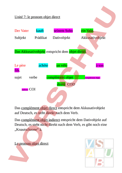 Unité 7: le pronom objet direct Der Vater Subjekt kauft seinem Sohn Prädikat Dativobjekt ein Velo. Akkusativobjekt Das Akkusativobjekt entspricht dem objet direct. Le père fils. sujet achète verbe un vélo complément objet à son complément objet direct COD indirect COI Das complément objet direct entspricht dem Akkusativobjekt auf Deutsch, es steht direkt nach dem Verb. Das complément objet indirect entspricht dem Dativobjekt auf Deutsch, es steht nicht direkt nach dem Verb, es gibt noch eine „Knautschzone à. Le pronom objet direct Um Wortwiederholungen zu vermeiden und um möglichst schlanke Sätze schreiben zu können, wird das direkte Objekt durch ein Pronomen ersetzt. Ich esse einen Apfel. Ich habe ihn im Coop gekauft. Je vois le chien de mon voisin. Je le vois. Tu vois la fleur. Tu la vois. Tu connais les fleurs. Tu les connais. Je mange cette pomme. Je la mange. Elle aime les montagnes. Elle les aime. Roger porte le sac. Roger le porte. Fabienne mange son sandwich. Fabienne le mange. Nous aimons nos animaux. Nous les aimons. Die Satzstellung Merkregel 1 Grundsätzlich steht das Pronomen vor dem konjugierten Verb. Bsp. Je vois le sommet. Je le vois. Merkregel 2 Bei Modalverben wie « pouvoir », « vouloir », « devoir » und im futur composé steht das Pronomen vor dem Infinitiv. Bsp. Je veux voir le château. Je veux le voir. Je dois nettoyer cette fenêtre. Je dois la nettoyer. Il veut manger les tomates. Il veut les manger. Merkregel 3 Beim Imperativ hänge ich das Pronomen mit einem Bindestrich hinten an das Verb. Bsp. Mets ton pull. Mets-le. Mettez votre écharpe. Mettez- la. Mange les pommes. Mange-les. Merkregel 4 Beim Imperativ in der Verneinung steht das Pronomen jedoch wie üblich vor dem Verb. Bsp. Ne mets pas ton pull. Ne le mets pas. Ne mettez pas votre écharpe. Ne la mettez pas. Ne mangez pas les pommes. Ne les mangez pas. Die normale Verneinung kann sich sehr gut gemerkt werden Je mange la pomme. Je la mange. Je ne mange pas la pomme. Je ne la mange pas.