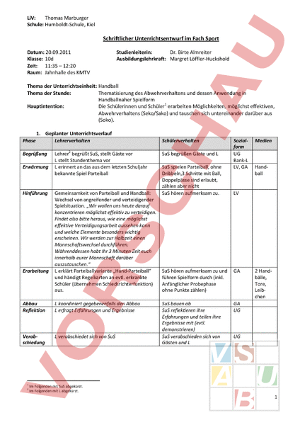 LiV: Thomas Marburger Schule: Humboldt-Schule, Kiel Schriftlicher Unterrichtsentwurf im Fach Sport Datum: 20.09.2011 Klasse: 10d Zeit: 11:35 – 12:20 Raum: Jahnhalle des KMTV Studienleiterin: Dr. Birte Almreiter Ausbildungslehrkraft: Margret Löffler-Huckshold Thema der Unterrichtseinheit: Handball Thema der Stunde: Thematisierung des Abwehrverhaltens und dessen Anwendung in Handballnaher Spielform Hauptintention: Die Schülerinnen und Schüler1 erarbeiten Möglichkeiten, möglichst effektiven, Abwehrverhaltens (Seko/Sako) und tauschen sich untereinander darüber aus (Soko). Phase 1. Geplanter Unterrichtsverlauf Lehrerverhalten Begrüßung Erwärmung Hinführung Erarbeitung Lehrer2 begrüßt SuS, stellt Gäste vor stellt Stundenthema vor erinnert an das aus dem letzten Schuljahr bekannte Spiel Parteiball Gemeinsamkeit von Parteiball und Handball: Wechsel von angreifender und verteidigender Spielsituation. „Wir wollen uns heute darauf konzentrieren möglichst effektiv zu verteidigen. Findet also bitte heraus, wie eine möglichst effektive Verteidigungsarbeit aussehen kann und welche Elemente besonders wichtig erscheinen. Wir werden zur Halbzeit einen Mannschaftswechsel durchführen. Währenddessen habt Ihr 3 Minuten Zeit euch innerhalb eurer Mannschaft darüber auszutauschen. erklärt Parteiballvariante „Hand-Parteiball und händigt Regelkarten an evtl. erkrankte Schüler (übernehmen Schiedsrichterfunktion) aus. Abbau Reflektion koordiniert gegebenenfalls den Abbau erfragt Erfahrungen und Ergebnisse Verabschiedung verabschiedet sich von SuS 1 2 Schülerverhalten SuS begrüßen Gäste und SuS spielen Parteiball, ohne Dribbeln,3 Schritte mit Ball, Doppelpässe sind erlaubt, zählen aber nicht SuS hören aufmerksam zu. Sozialform UG Bank-L LV, GA Medien Handball LV SuS hören aufmerksam zu und führen Spielform durch (inkl. Anfänglicher Probephase ohne Punkte zählen) GA SuS bauen ab SuS reflektieren ihre Erfahrungen und teilen ihre Ergebnisse mit (evtl. demonstrieren) SuS verabschieden sich von Gästen und GA UG 2 Handbälle, Tore, Leibchen UG Im Folgenden mit SuS abgekürzt. Im Folgenden mit abgekürzt. 1 2. Unterrichtliche Voraussetzungen a) Lerngruppe Die Lerngruppe 10d besteht momentan aus 9 Schülerinnen und 16 Schülern. Ich kenne die Klasse bereits seit über einem Jahr, da ich sie als Vertretungslehrkraft („nulltes Semester) im ersten Halbjahr der Klasse 9 bereits in Englisch und im vergangenen Halbjahr in Sport eigenverantwortlich unterrichtet habe. Es handelt sich um eine sehr lebhafte, überwiegend sportliche und auch sportbegeisterte Klasse. Es sind auch aktive HandballerInnen dabei. Es hat sich gezeigt, dass die Klasse gefordert werden will und dass für Manche subjektiv als langweilig empfundene Aufgaben, die sie unterfordern mit teils erheblichen Störungen quittiert werden. Obwohl die Klasse generell als sehr sportlich bezeichnet werden kann, gibt es einzelne Schüler die durch ihre Energien hervorstechen und dies divergent in ihren Ausrichtungen. Vor allem bei den Jungen sind zum Teil starke Unterschiede in den körperlichen Ausmaßen und Fähigkeiten festzustellen, was sich auch im Sportunterricht niederschlagen kann. Meist finden jedoch alle Beteiligten ihre Positionen im Unterrichtsgeschehen. Ein Kern von 1–3 Schülern () zeigt regelmäßig den Unterrichtsverlauf störende Aufmerksamkeitsschwierigkeiten, denen bis jetzt am effektivsten mit intensiver sportlicher Beschäftigung begegnet werden konnte. b) Curriculares Umfeld Die heutige Stunde ist die dritte der Einheit. Nach einer ersten kreativ-spielerischen Einführungsstunde mit Wiederholung des Schlagwurfs schloss eine Stunde mit Passen und Fangen als thematischem Fokus an. Es folgen Stunden nach dem spielgemäßen Konzept zu Angriffsverhalten, Dreischrittrhytmus mit anschließendem Schlagwurf, Sprungwürfen, über Spielformen mit verschiedenen Mannschaftszahlenverhältnissen bis zum Zielspiel 7:7 auf dem großen Feld. Die Stunde findet in der Jahnhalle des Kieler Männerturnvereins statt. Diese befindet sich in einer Entfernung von etwa sechs Gehminuten von der Humboldt-Schule. Da vor der Stunde nur eine Fünfminutenpause ist, kann mit einem Stundenanfang, in Beachtung der für das Umziehen benötigten Zeit, um etwa 11:40 Uhr gerechnet werden. Da die Klasse jedoch im Anschluss eine Freistunde hat, kann die Stunde bis zu ihrem regulären Ende genutzt werden. Es ist also von einer effektiven Unterrichtszeit von maximal 40 Minuten auszugehen. 3. Vorstellung des Unterrichtsgegenstandes Der Torraum, der von keinem Feldspieler betreten werden darf, verändert die taktische Grundsituation gegenüber anderen Spielsportarten wie z.B. dem Fußball erheblich: Beim Handball findet das Spiel fast ausschließlich nahe und entlang der Torraumgrenze statt. Das Mittelfeld wird in der Regel sehr schnell überwunden; eine 1:1Abwehrhandlung ist dort generell eher ineffektiv. Die Angreifer versuchen die gesamte Spielfeldbreite auszunutzen und den Ball so schnell wie möglich hin- und herzuspielen, um Lücken in die Abwehrformation zu provozieren und dadurch zum Torwurf zu kommen. Für die Abwehr ergeben sich aus dieser Grundsituation zwei Konsequenzen: a) Das Spiel verlangt ein effektives individuelles Abwehrverhalten, um einzelne Angreifer aufzuhalten. b) Die abwehrende Mannschaft muss eine sinnvolle Gruppentaktik anwenden, da der Torraum ansonsten nur schwer mit sechs Spielern abzudecken ist. Zu a): Individuelles Abwehrverhalten Die Grundstellung in der Abwehr orientiert sich am zu erwartenden Verhalten des Angreifers, der versucht, mit einem Wurf ein Tor zu erzielen. Da der Ball dabei immer in einer Hand, seitlich vom Körper, geführt wird, sollte der Abwehrspieler grundsätzlich eine schräge Position zum Angreifer einnehmen. Die Füße befinden sich dabei im Anfängerbereich in Schritt-Grätschstellung, der Fuß auf der Seite des Wurfarmes des Angreifers ist vorne. Hüfte und Oberkörper sind dabei zumindest im Anfänger