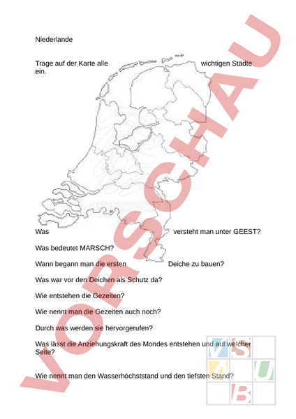 Niederlande Trage auf der Karte alle ein. Was wichtigen Städte versteht man unter GEEST? Was bedeutet MARSCH? Wann begann man die ersten Deiche zu bauen? Was war vor den Deichen als Schutz da? Wie entstehen die Gezeiten? Wie nennt man die Gezeiten auch noch? Durch was werden sie hervorgerufen? Was lässt die Anziehungskraft des Mondes entstehen und auf welcher Seite? Wie nennt man den Wasserhöchststand und den tiefsten Stand? Wie nennt man das Steigen und Fallen des Wassers? Was ist der „Tidenhub? Was ist „Normalnull? Warum ist diese Linie so wichtig? Wie müssen Sonne, Mond und Erde zueinander stehen, dass es zu einer Springflut kommen kann? Was versteht man unter „Lahnung? Wie wurden diese Lahnungen gebaut?