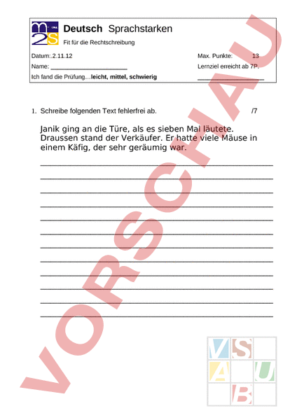 Deutsch Sprachstarken Fit für die Rechtschreibung Datum:.2.11.12 Max. Punkte: Name: Lernziel erreicht ab 7P. Ich fand die Prüfungleicht, mittel, schwierig 1. Schreibe folgenden Text fehlerfrei ab. 13 /7 Janik ging an die Türe, als es sieben Mal läutete. Draussen stand der Verkäufer. Er hatte viele Mäuse in einem Käfig, der sehr geräumig war. 2. Wörter nachschlagen im Wortprofi. /4 Lernziel: Du kannst im Wörterbuch nachschlagen. Schlage folgende Wörter im Wortprofi und notiere die Seitenzahl! Mäuse Schlittenfahrt gesungen stärker 3. Rechtschreibregeln anwenden /2 Finde ein Wort, das diesen Stamm enthält! brech fahrt Selbsteinschätzung Ich kann einen Text fehlerfrei abschreiben. Ich kann im Wörterbuch Wörter nachschlagen. Ich kann zu einem Wortstamm gleiche Wörter finden. Ja Geht so Nein Fremdeinschätzung Du kannst einen Text fehlerfrei abschreiben. Du kannst im Wörterbuch Wörter nachschlagen. Du kannst zu einem Wortstamm gleiche Wörter finden. Ja Geht so Nein Viel Glück!