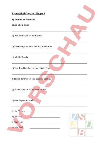 Französisch Vocitest Etape 7 1) Traduis en français! a) Da ist ein Haus. b) Auf dem Dach ist ein Kamin. c) Die Garage hat eine Tür und ein Fenster. d) Ich bin Tourist. e) Vor dem Bahnhof ist (hat es) ein Park. f) Hinter der Post ist (hat es) eine Schule. g) Frau Châtelain ist auf dem Markt. h) eine Suppe für mich i) eine Treppe k) ich sehe l) einen Lift m) die Bank n) die Konditorei o) ich suche p) Nimm q) das Schwimmbad r) eine Telefonkabine_ s) wahr t) Vielen Dank u) das Auto 2) Traduis en allemand! a) Dans le jardin, il a une fontaine. b) Jai une maison sans garage. c) un balcon et une terrasse d) Où est le cinéma? e) Le film est au cinema Rex. f) Voilà un restaurant. g) un bateau et un train h) une tulipe i) la cave k) un store l) un hotel m) laéroport n) une église o) Mademoiselle p) le footballeur q) Pour aller r) un étage s) jhabite t) une blouse u) le stade Bonne chance!