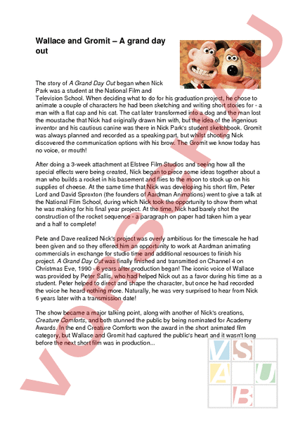 Wallace and Gromit – grand day out The story of Grand Day Out began when Nick Park was student at the National Film and Television School. When deciding what to do for his graduation project, he chose to animate couple of characters he had been sketching and writing short stories for man with flat cap and his cat. The cat later transformed into dog and the man lost the moustache that Nick had originally drawn him with, but the idea of the ingenious inventor and his cautious canine was there in Nick Park student sketchbook. Gromit was always planned and recorded as speaking part, but whilst shooting Nick discovered the communication options with his brow. The Gromit we know today has no voice, or mouth! After doing 3week attachment at Elstree Film Studios and seeing how all the special effects were being created, Nick began to piece some ideas together about man who builds rocket in his basement and flies to the moon to stock up on his supplies of cheese. At the same time that Nick was developing his short film, Peter Lord and David Sproxton (the founders of Aardman Animations) went to give talk at the National Film School, during which Nick took the opportunity to show them what he was making for his final year project. At the time, Nick had barely shot the construction of the rocket sequence paragraph on paper had taken him year and half to complete! Pete and Dave realized Nick project was overly ambitious for the timescale he had been given and so they offered him an opportunity to work at Aardman animating commercials in exchange for studio time and additional resources to finish his project. Grand Day Out was finally finished and transmitted on Channel 4 on Christmas Eve, 1990 6 years after production began! The iconic voice of Wallace was provided by Peter Sallis, who had helped Nick out as favor during his time as student. Peter helped to direct and shape the character, but once he had recorded the voice he heard nothing more. Naturally, he was very surprised to hear from Nick 6 years later with transmission date! The show became major talking point, along with another of Nick creations, Creature Comforts, and both stunned the public by being nominated for Academy Awards. In the end Creature Comforts won the award in the short animated film category, but Wallace and Gromit had captured the public heart and it wasnt long before the next short film was in production. Summary Wallace and Gromit are devastated when they realise that they have run out of cheese. With the local corner shop closed for the Bank Holiday, Wallace decides to take trip to the moon, as everybody knows the moon made of cheese. Naturally, he has to take his faithful dog with him. The two build rocket in Wallace basement and set off to the moon. Upon landing, Wallace tries the cheese (which he suggests tastes like Wensleydale) but starts to question his theory on the moon. Also, strange coinoperated robot shaped like an oven (complete with arms, wheels and and creepy weird eyes) is encountered by the duo and seems to wish to go with them to Earth so he can try out some skiing. Wallace and Gromit believe it is after them for stealing the moon cheese and try to escape. The robot breaks into the rocket but is blown out by gas explosion, allowing Wallace and Gromit to escape back home. The robot uses wreckage from the rocket as skiing equipment, and happily skis across the moon surface, waving goodbye to Wallace and Gromit as they return home.