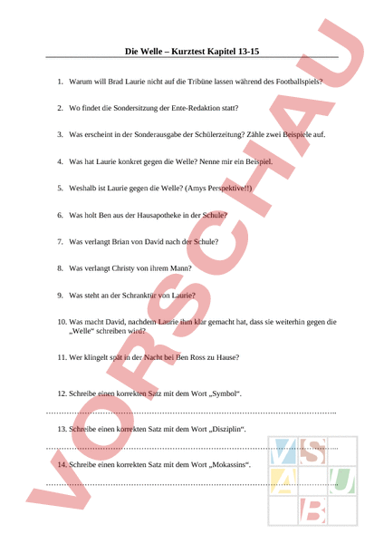 Die Welle – Kurztest Kapitel 13-15 1. Warum will Brad Laurie nicht auf die Tribüne lassen während des Footballspiels? 2. Wo findet die Sondersitzung der Ente-Redaktion statt? 3. Was erscheint in der Sonderausgabe der Schülerzeitung? Zähle zwei Beispiele auf. 4. Was hat Laurie konkret gegen die Welle? Nenne mir ein Beispiel. 5. Weshalb ist Laurie gegen die Welle? (Amys Perspektive!!) 6. Was holt Ben aus der Hausapotheke in der Schule? 7. Was verlangt Brian von David nach der Schule? 8. Was verlangt Christy von ihrem Mann? 9. Was steht an der Schranktür von Laurie? 10. Was macht David, nachdem Laurie ihm klar gemacht hat, dass sie weiterhin gegen die „Welle schreiben wird? 11. Wer klingelt spät in der Nacht bei Ben Ross zu Hause? 12. Schreibe einen korrekten Satz mit dem Wort „Symbol. 13. Schreibe einen korrekten Satz mit dem Wort „Disziplin. . 14. Schreibe einen korrekten Satz mit dem Wort „Mokassins. .