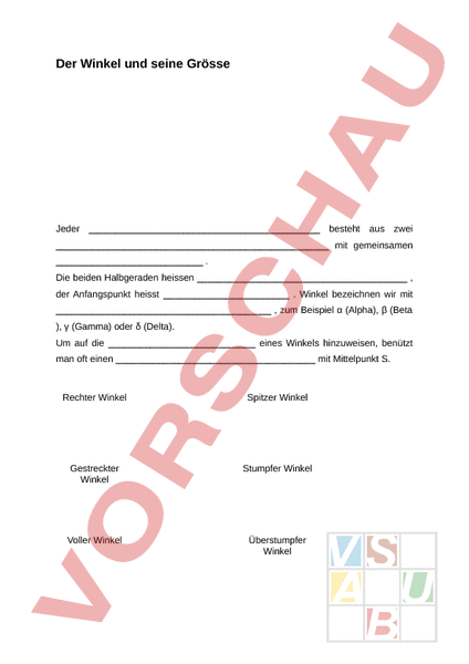 Der Winkel und seine Grösse Jeder besteht aus zwei mit gemeinsamen Die beiden Halbgeraden heissen der Anfangspunkt heisst Winkel bezeichnen wir mit zum Beispiel (Alpha), (Beta ), (Gamma) oder (Delta). Um auf die eines Winkels hinzuweisen, benützt man oft einen mit Mittelpunkt S. Rechter Winkel Spitzer Winkel Gestreckter Winkel Stumpfer Winkel Voller Winkel Überstumpfer Winkel Winkel abtragen Aufgabe: Addiere die Winkel . 1. 2. 3. 4. 5. Die Winkelhalbierende Eine die einen Winkel, heisst Winkelhalbierende. Sie wird meistens mit bezeichnet. Sie wird folgendermassen konstruiert: 1. 2. 3. So ist die Winkelhalbierende entstanden. Winkel messen Je im nebenan abgebildeten Winkel der_ gedreht wird, desto ist der entsprechende Die eines Winkels ist das Mass für die Grösse einer Bereits im Altertum hat man als folgendes festgelegt: Den Teil eines nennt man 1 , geschrieben 1. Als benützen wir das 60-Winkel konstruieren 1. Zeichne mit einem beliebigen einen um den Punkt A. 2. Den Radius im nicht verändern. 3. Beim des Kreisbogens und der Geraden einstecken und den Radius auf den abtragen. 4. So entsteht ein.
