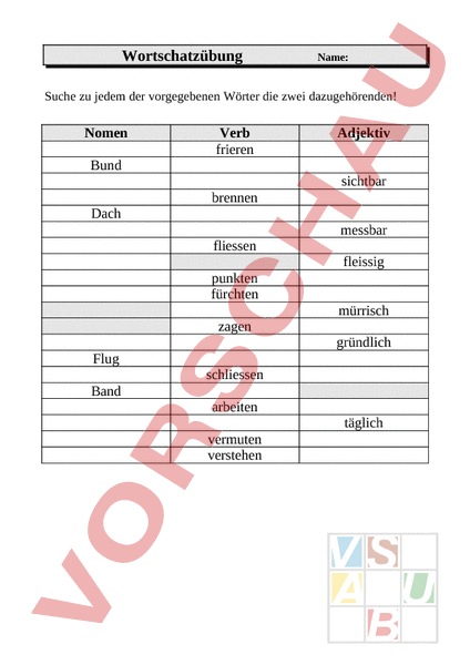 Wortschatzübung Name: Suche zu jedem der vorgegebenen Wörter die zwei dazugehörenden! Nomen Verb frieren Adjektiv Bund sichtbar brennen Dach messbar fliessen fleissig punkten fürchten mürrisch zagen gründlich Flug schliessen Band arbeiten täglich vermuten verstehen Wortschatzübung Name: Suche zu jedem der vorgegebenen Wörter die zwei dazugehörenden! Nomen Frost Bund Sicht Brand Dach Mass Fluss Fleiss Punkt Furcht Grund Flug Schluss Band Arbeit Tag Mut Verstand Verb frieren/frösteln binden sehen brennen decken messen fliessen punkten fürchten murren zagen gründen fliegen schliessen binden arbeiten tagen vermuten verstehen Adjektiv frostig bündig sichtbar brennbar bedeckt messbar flüssig fleissig pünktlich furchtbar/fürchterlich mürrisch zaghaft gründlich flügge schlüssig arbeitsam täglich mutig verständlich Wortschatzübung Name: Setze in den Sätzen das jeweilig abgeleitete Ajektiv/Verb oder Nomen ein! Beispiel: arbeiten: Sie lobte die des Angestellten. Furcht: Antonia ist wieder einmal hingefallen. Schluss: Kannst du mir bitte die Autotüre . zagen: Sabrina hat sich dem Tier nur genähert. Tag: Die zwei Freunde sehen sich nicht mehr. Grund: Kannst du mir dein Benehmen bitte. frostig: Die Kinder, weil nicht geheizt wird. arbeiten: Der Lehrer lobt die 5. Klässlerinnen. mutig: Ich , dass es Sebastian war. fliessen: Sogar Eisen kann bei Grosser Hitze werden. sehen: Die Insel ist schon von weitem .