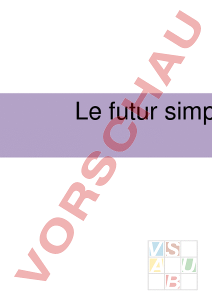 Le futur simple Bildung des futur simple Personen Gruppe auf er Gruppe auf ir Gruppe auf re 1. Person Sing. jaimerai je finirai je vendrai 2. Person Sing. tu aimeras tu finiras tu vendras 3. Person Sing. il/elle aimera il/elle finira il/elle vendra 1. Person Plural nous aimerons nous finirons nous vendrons 2. Person Plural vous aimerez vous finirez vous vendrez 3. Person Plural ils/elles aimeront ils/elles finiront ils/elles vendront Verwendung Verwendung • • • • Absicht für die Zukunft Beispiel:Demain je rangerai les dossiers.Morgen werde ich die Akten sortieren. Vermutung (für die Zukunft) Beispiel:Tu ne finiras jamais en une journée.Das wirst du an einem Tag nie schaffen. Höflichkeitsform (für die Gegenwart) Beispiel:Estce que tu pourras maider? Kannst du mir helfen? Konditionalsätze Beispiel:Si on range à deux, on finira plus vite. Wenn wir zu zweit aufräumen, werden wir schneller fertig sein. avoir et être Personen avoir être 1. Person Singular jaurai je serai 2. Person Singular tu auras tu seras 3. Person Singular il/elle/on aura il/elle/on sera 1. Person Plural nous aurons nous serons 2. Person Plural vous aurez vous serez 3. Person Plural ils/elles auront ils/elles seront Einige Ausnahmen aller jirai faire je fairai voir je verrai devoir je devrai venir je viendrai savoir je saurai courir je courrai pouvoir je pourrai tenir je tiendrai vouloir je voudrai envoyer jenverrai recevoir je recevrai