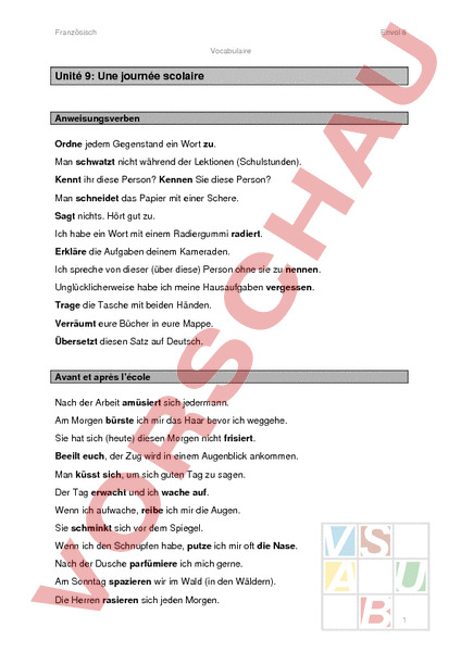 Französisch Envol 8 Vocabulaire Unité 9: Une journée scolaire Anweisungsverben Ordne jedem Gegenstand ein Wort zu. Man schwatzt nicht während der Lektionen (Schulstunden). Kennt ihr diese Person? Kennen Sie diese Person? Man schneidet das Papier mit einer Schere. Sagt nichts. Hört gut zu. Ich habe ein Wort mit einem Radiergummi radiert. Erkläre die Aufgaben deinem Kameraden. Ich spreche von dieser (über diese) Person ohne sie zu nennen. Unglücklicherweise habe ich meine Hausaufgaben vergessen. Trage die Tasche mit beiden Händen. Verräumt eure Bücher in eure Mappe. Übersetzt diesen Satz auf Deutsch. Avant et après lécole Nach der Arbeit amüsiert sich jedermann. Am Morgen bürste ich mir das Haar bevor ich weggehe. Sie hat sich (heute) diesen Morgen nicht frisiert. Beeilt euch, der Zug wird in einem Augenblick ankommen. Man küsst sich, um sich guten Tag zu sagen. Der Tag erwacht und ich wache auf. Wenn ich aufwache, reibe ich mir die Augen. Sie schminkt sich vor dem Spiegel. Wenn ich den Schnupfen habe, putze ich mir oft die Nase. Nach der Dusche parfümiere ich mich gerne. Am Sonntag spazieren wir im Wald (in den Wäldern). Die Herren rasieren sich jeden Morgen. 1 Französisch Envol 8 Vocabulaire Schau dich an. Du bist ganz schmutzig. Du hast gut gearbeitet. Erhole dich jetzt. Zuerst haben sie sich begrüsst, dann haben sie zu arbeiten begonnen. lécole Welches ist dein Lieblingsschulfach? Der Lehrer gibt uns Arbeitsanweisungen. Ich finde die Lösung nicht. Hilf mir! Die Situation ist interessant. Wir haben eine Videoszene gedreht. Der Lehrer schimpft mit uns, wenn er nicht zufrieden ist. Diese Übung ist sehr leicht. Deutsch ist eine schwierige Sprache zum Lernen. Die ersten Sequenzen dieses Filmes interessieren mich. Seid nicht laut (lärmig) im Unterricht. Dans la classe Schau dich im Spiegel an, um dich zu frisieren (wenn du dich frisierst). Schliesst den Wasserhahn. Das Wasser fliesst noch. Es gibt eine Pause nach jeder Lektion. Ruhe! Ich höre nichts. In meinem Zimmer ist immer Ordnung. Welche Unordnung! Räumt eure Sachen auf. In einer guten Atmosphäre arbeitet man gut. Ich habe die Gewohnheit, rechtzeitig zu kommen (anzukommen). Meine Geduld hat Grenzen. Antworte endlich! Les adjectifs Sie arbeitet immer, sie ist sehr ehrgeizig. 2 Französisch Envol 8 Vocabulaire Er träumt den ganzen Tag. Ist er verliebt? Die Schüler haben frei. Sie sind zufrieden. Bleibt ruhig! Habt keine Angst! Er hat unser Treffen vergessen. Ich bin sehr verärgert. Sei höflich und höre mir zu, wenn ich zu dir spreche. Sie ist traurig, weil ihre kleine Katze krank ist. Wenn man faul ist, arbeitet man nicht gern. Diese Schülerin arbeitet gut. Sie ist sehr fleissig. Mots utiles So (Auf diese Art) endet die Geschichte. Manchmal habe ich keine Lust, in die Schule zu gehen. Lest den Text abwechslungsweise. Sie vergisst oft die Hausaufgaben. Ich habe die Zeit (die Stunde) vergessen. Ich bin zu spät. Sie ist früh (an)gekommen. Sie ist nicht gern verspätet. (Sie liebt es nicht, verspätet zu sein.) 3 Französisch Envol 8 Vocabulaire Unité 10: Lhabit ne fait pas le moine Les vêtements et les accessoires Um Sport zu treiben, zieht man Turnschuhe an. Zu Hause trägt man Pantoffeln. Die Sandalen sind im Sommer bequem. Diese Lederjacke passt gut zu meinen Jeans. Er hat eine Uhr in der Gilettasche. Die Windjacke hält warm in den Bergen. Ich habe einen warmen Mantel für den Winter gekauft. Die Jeans sind jederzeit (für alle Tage) praktisch. Die Leggins, das ist bequem, aber nicht elegant. Eine weisse Damenbluse mit (auf) einer schwarzen Hose, das ist immer elegant. Sie hat ihr schwarzes Kostüm angezogen, um ins Theater zu gehen. Mein Grossvater liebt (die) Wollsocken. Man findet Strumpfhosen in allen Farben. Der Führende (Meister) der Tour de France trägt das gelbe Leibchen. Jedermann trägt einen Slip. Meine Mutter liebt (die) Seidenfoulards. Die Basken trägen eine Baskenmütze auf dem Kopf. Die Geschäfte bieten eine Papiertasche an, um die Waren nach Hause zu tragen. Die Handtasche von Claire passt gut zu ihren Schuhen. Sie hat eine Goldbrosche an ihren Mantel gesteckt. Der Judomeister trägt den schwarzen Gürtel. In der Nacht zieht man einen Schlafanzug zum Schlafen an. Die Hosenträger halten die Hose. Wenn es regnet, zieht man einen Regenmantel an. Die Kinder spielen in Latzhosen im Garten. Die Büstenhalter sind für die Frauen. 4 Französisch Envol 8 Vocabulaire Les adjectifs les couleurs Der Himmel ist dunkelgrau. Es wird ein Gewitter geben. Wir haben ein fröhliches Lied gesungen. Die Mädchen haben oft rosa Kleider gern. Meine kleine Schwester ist hübsch. Sie gefällt jedermann. Julia ist elegant. Sie kleidet sich gut. Er trägt einen blauen Anzug. Das ist klassisch. Die Hosenträger, die sind veraltet. Meine Schuhe sind alt und abgenutzt. Die Jeans ist eine solide Hose. Kauf diese Stiefel. Sie sind sehr widerstandsfähig. Ein Pyjama muss bequem sein. Die Seide ist leicht und elegant. Dieses Kleid ist zu weit. Haben Sie ein engeres? Ich kann diese Jacke nicht anziehen. Sie ist zu eng. Nehmen Sie diesen Pullover. Es ist ein Spezialangebot. Ich habe das Hemd gewaschen. Es ist sauber. Paul, sei nett und hilf mir. Au magasin Dies ist ein Modegeschäft für die Jungen. Man findet hier billige und modische Kleider. Ich werde eine neue Strumpfhose kaufen. Diese Damenbluse passt nicht zu diesem Jupe. Kann ich die Schuhe probieren? Sie ist immer gut angezogen. Die Frauen ziehen oft Hosen den Jupes vor. Das ist nicht teuer. Das ist ein guter Preis. Wie findest du diese Handtasche? – Ich finde sie chic. 5 Französisch Envol 8 Vocabulaire In diesem Modegeschäft hat es eine grosse Auswahl an Pullovern. Die Umkleidekabinen befinden sich hinten im Geschäft. Les motifs, la forme et la matière Die Wolle ist ein Naturprodukt. Das ist eine Seidenbluse. Sie ist sehr bequem und elegant. Sie zieht die einfachen Motive(Muster) vor. Ich habe die gestreiften Pullover nicht gern. Der Kilt ist ein kar
