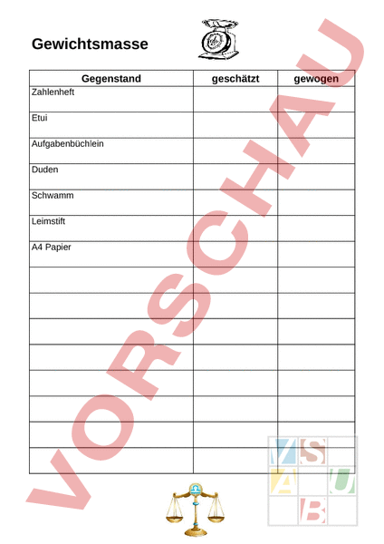 Gewichtsmasse Gegenstand Zahlenheft Etui Aufgabenbüchlein Duden Schwamm Leimstift A4 Papier geschätzt gewogen