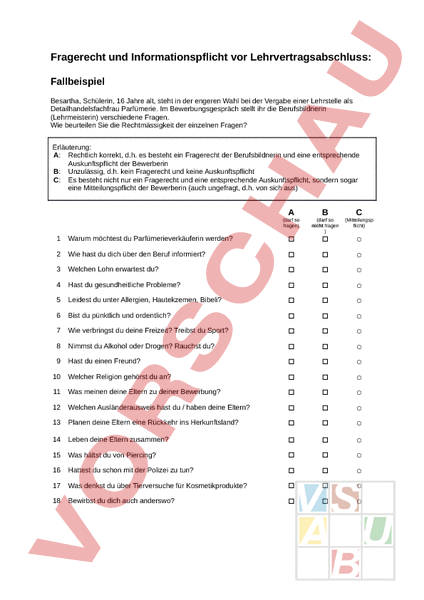 Fragerecht und Informationspflicht vor Lehrvertragsabschluss: Fallbeispiel Besartha, Schülerin, 16 Jahre alt, steht in der engeren Wahl bei der Vergabe einer Lehrstelle als Detailhandelsfachfrau Parfümerie. Im Bewerbungsgespräch stellt ihr die Berufsbildnerin (Lehrmeisterin) verschiedene Fragen. Wie beurteilen Sie die Rechtmässigkeit der einzelnen Fragen? Erläuterung: A: Rechtlich korrekt, d.h. es besteht ein Fragerecht der Berufsbildnerin und eine entsprechende Auskunftspflicht der Bewerberin B: Unzulässig, d.h. kein Fragerecht und keine Auskunftspflicht C: Es besteht nicht nur ein Fragerecht und eine entsprechende Auskunftspflicht, sondern sogar eine Mitteilungspflicht der Bewerberin (auch ungefragt, d.h. von sich aus) (darf so fragen) (darf so nicht fragen (Mitteilungsp flicht) 1 Warum möchtest du Parfümerieverkäuferin werden? 2 Wie hast du dich über den Beruf informiert? 3 Welchen Lohn erwartest du? 4 Hast du gesundheitliche Probleme? 5 Leidest du unter Allergien, Hautekzemen, Bibeli? 6 Bist du pünktlich und ordentlich? 7 Wie verbringst du deine Freizeit? Treibst du Sport? 8 Nimmst du Alkohol oder Drogen? Rauchst du? 9 Hast du einen Freund? 10 Welcher Religion gehörst du an? 11 Was meinen deine Eltern zu deiner Bewerbung? 12 Welchen Ausländerausweis hast du haben deine Eltern? 13 Planen deine Eltern eine Rückkehr ins Herkunftsland? 14 Leben deine Eltern zusammen? 15 Was hältst du von Piercing? 16 Hattest du schon mit der Polizei zu tun? 17 Was denkst du über Tierversuche für Kosmetikprodukte? 18 Bewirbst du dich auch anderswo? Lösungen A: Rechtlich korrekt, d.h. es besteht ein Fragerecht der Berufsbildnerin und eine entsprechende Auskunftspflicht der Bewerberin B: C: Unzulässig, d.h. kein Fragerecht und keine Auskunftspflicht Es besteht nicht nur ein Fragerecht und eine entsprechende Auskunftspflicht, sondern sogar eine Mitteilungspflicht der Bewerberin (auch ungefragt, d.h. von sich aus) 1 2 3 4 5 6 7 8 9 10 11 12 13 14 15 16 17 18 Warum möchtest du Parfümerieverkäuferin werden? Thema: Motivation Wie hast du dich über den Beruf informiert? Thema: Interesse Welchen Lohn erwartest du? Hast du gesundheitliche Probleme? Nur bei Berufsrelevanz zu erwähnen Leidest du unter Allergien, Hautekzemen, Bibeli? Nur bei Berufsrelevanz zu erwähnen Bist du pünktlich und ordentlich? Thema: Zuverlässigkeit Wie verbringst du deine Freizeit? Treibst du Sport? Ist Privatsphäre! Darf es sagen, muss aber nicht, Freizeit darf aber nicht mit Beruf konkurrieren Nimmst du Alkohol oder Drogen? Rauchst du? Darf nur bei Beeinträchtigung und klaren Hinweisen gefragt werden! Hast du einen Freund? Privatsphäre Welcher Religion gehörst du an? Privatsphäre, ausser bei Betrieb wo es wichtig ist (z.B. KV bei Kirchgemeinde!) Was meinen deine Eltern zu deiner Bewerbung? Eltern sind involviert, da Le noch unmündig! Welchen Ausländerausweis hast du haben deine Eltern? Eigener: Steht im Lehrvertrag, über Eltern muss keine Auskunft gegeben werden (Privat) Planen deine Eltern eine Rückkehr ins Herkunftsland? Privatsphäre Leben deine Eltern zusammen? Privatsphäre, Fragen zum Sorgerecht/Ansprechperson sind ok! Was hältst du von Piercing? Thema Gesinnung ist privat! Frage muss anders gestellt werden: z.B. Regelung des Betriebs durchgeben („Keine sichtbaren Piercings.) Hattest du schon mit der Polizei zu tun? Nur wenn auf Beruf bezogen! (z.B. Chauffeur: Verkehrsstrafen, Buchhalter: Unterschlagung.) Was denkst du über Tierversuche für Kosmetikprodukte? Gesinnung ist Privatsache! Bewirbst du dich auch anderswo? Ist nicht arbeitsplatzrelevant! (darf so fragen) (darf so nicht fragen (Mitteilungsp flicht)