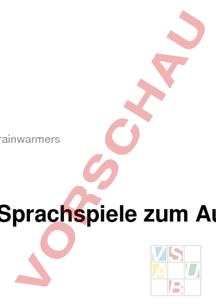 Brainwarmers Sprachspiele zum Aufwärmen Nomen Schreibe zu jedem Buchstaben des Alphabets ein Nomen auf. Wer zuerst fertig ist ruft «Stopp». Namen sind nicht erlaubt. Nomen Finde möglichst viele Nomen zum gegebenen Buchstaben. Die Zeit ist begrenzt. Nomen Es dürfen nur diese Buchstaben verwendet werden: E I N S Wenn man Anzahl und Reihenfolge der Buchstaben frei wählt, kann man über 40 Nomen bilden. Wer findet am meisten? Nomen Elefant Trampolin Nase Esel Laus Suche ein Nomen zum jeweilig letzten Buchstaben des vorangegangenen Nomen. Zusammengesetzte Nomen Haustür ürschloss Schlossturm Turm Bilde zusammengesetzte Nomen. Was für ein Durcheinander! Kuhbock Wandfall Holzschreiber Mistregen Gemüseschran Rasenzelt Purzelhase Kugelbaum Feuergarten Wasserstall Platzstand Kopfwehr Zirkusmäher Angsthaufen Kombiniere! Stunde Bahn Laub Rose Fisch Knacke Wagen Foto Stift Bett Gas Herd Schnee Beutel Baum Fleisch Wind Geld Last Blei Nuss Appara Seil Gold Morgen Mann Fluss Rind Palindrome (Spiegelwörter) Finde Palindrome, das sind Wörter, die vorwärts und rückwärts gelesen das selbe Wort bilden. z.B. Otto, Anna Kannst du auch ganze Palindrom Sätze bilden? Alle necken Ella. Alle Wortarten Nomen Verb Adjektiv Pronomen Partikel