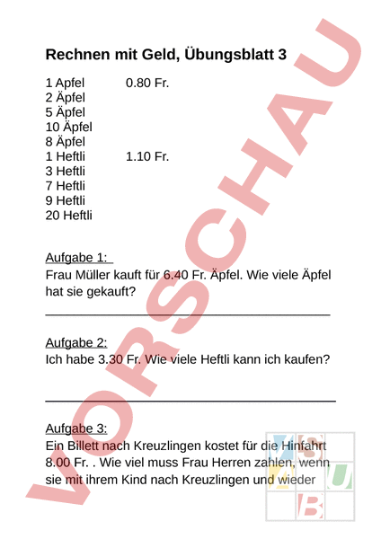 Rechnen mit Geld, Übungsblatt 3 1 Apfel 2 Äpfel 5 Äpfel 10 Äpfel 8 Äpfel 1 Heftli 3 Heftli 7 Heftli 9 Heftli 20 Heftli 0.80 Fr. 1.10 Fr. Aufgabe 1: Frau Müller kauft für 6.40 Fr. Äpfel. Wie viele Äpfel hat sie gekauft? Aufgabe 2: Ich habe 3.30 Fr. Wie viele Heftli kann ich kaufen? Aufgabe 3: Ein Billett nach Kreuzlingen kostet für die Hinfahrt 8.00 Fr. Wie viel muss Frau Herren zahlen, wenn sie mit ihrem Kind nach Kreuzlingen und wieder zurück nach Altnau fährt? (Kinder zahlen nur die Hälfte)