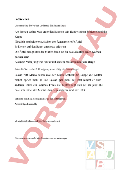 Satzzeichen Unterstreiche die Verben und setze die Satzzeichen! Am Freitag suchte Max unter den Bäumen sein Handy seinen Schlüssel und die Kappe Plötzlich entdeckte er zwischen den Ästen rote reife Äpfel Er klettert auf den Baum um sie zu pflücken Die Äpfel bringt Max der Mutter damit sie für das Schulfest einen Kuchen backen kann Als mein Vater jung war fuhr er mit seinem Motorrad über alle Berge Setze die Satzzeichen! Korrigiere, wenn nötig, die Satzanfänge! Saskia ruft Mama schau mal der Mann schlürft die Suppe die Mutter mahnt sprich nicht so laut Saskia gibt nicht auf jetzt nimmt er vom anderen Teller ein Pommes Frites die Mutter regt sich auf sei jetzt still hole mir bitte den Mantel den Regenschirm und den Hut Schreibe den Satz richtig und setze die Satzzeichen! Amselfinkundstarsindda ichwerdenachschauenwelcherfilmheutezusehenist Diemutterkommtvonderleiterherunterummiretwaszusagen