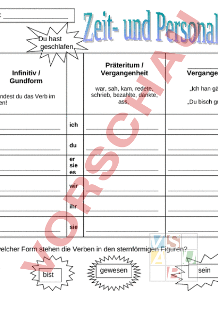 Name: Du hast geschlafen. Infinitiv Gundform So findest du das Verb im Duden! Er sah müde aus. Präteritum Vergangenheit Vergangenheit war, sah, kam, redete, schrieb, bezahlte, dankte, ass, „Ich han gässe. „Du bisch grännt. Präsens jetzt ich du er sie es wir ihr sie In welcher Form stehen die Verben in den sternförmigen Figuren? fiel bist gewesen sein hast gesunge hiel 1. Male sie in der gleichen Farbe aus, die du für die Zeitformenkolonne verwendest. 2. Ergänze die Tabelle. 3. Wähle einige Verben von der Tafel oder der Tabelle aus und schreibe damit zwei bis drei Kürzestgeschichten, so wie sie im Buch auf Seite 90 zu finden sind.