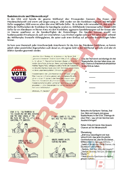 Basisdemokratie und Elitenwettkampf In den USA wird beinahe der gesamte Wahlkampf über Privatspenden finanziert. Die Kosten einer Präsidentschaftswahl sind enorm und steigen stetig an. 1996 wurden von den Kandidaten insgesamt 449 Millionen Dollar ausgegeben, 2008 waren es schon über einer Milliarde Dollar. Es ist daher nicht verwunderlich, dass etwa die Hälfte der Wahlkampfzeit der Kandidaten für Spendegalas verplant ist. Wohlhabende Unterstützer zahlen oftmals 2300 Dollar für ein Abendessen im kleinen Kreis mit dem Kandidaten; aggressive Spendekampagnen auf der Strasse oder im Internet appellieren an die Spendewilligkeit der Parteianhänger. Die Spenden kommen sowohl von hunderttausenden Privatleuten als auch von Unternehmen. Laut Kritikern ergeben sich zum Teil daher schon während des Wahlkampfes finanzielle Abhängigkeiten, die später auch einen Einfluss auf politische Entscheidungen haben können. So kann zwar theoretisch jeder Amerikaner/jede Amerikanerin für das Amt des Präsidenten kandidieren, es kommt jedoch neben persönlichen Eigenschaften auch darauf an, ob eigenes Geld in den Wahlkampf gebracht wird oder ob effektiv Spenden gesammelt werden. Lies den Text durch und überlege dir drei Eigenschaften, die man haben muss, um eine Chance als Präsidentschaftskandidat in den USA zu haben. • • • Betrachte die Karikatur. Yankees, Red Sox, Mets und Angels sind grosse Baseballteams in den USA. Überlege dir einen Titel – was will der Zeichner zum Ausdruck bringen? Haben Clubs mit teuren Stars bessere Chancen auf die Meisterschaft? Übersetzung: „Jetzt ist ja Saisonbeginn und man wünscht sich, dass jeder die gleiche Gewinnchance hat, aber für die kleinen Mitbewerber ist das ja aussichtslos. „Letztlich bleiben nur die im Rennen, die das meiste Geld haben. „Yankees, Red Sox, Mets und Angels? „Giuliani, Romney, McCain, Clinton und Obama*. Wohlhabende Kandidaten der beiden grossen Parteien.