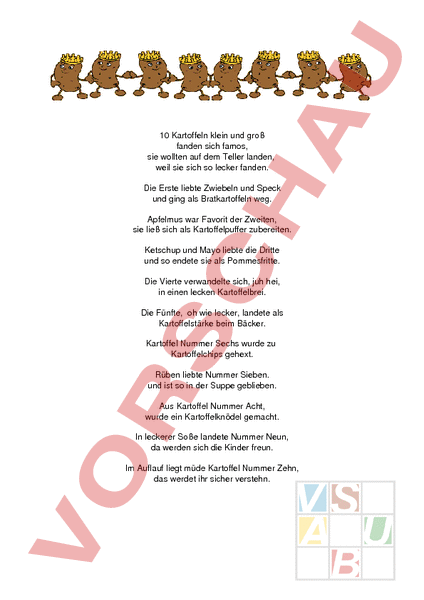 10 Kartoffeln klein und groß fanden sich famos, sie wollten auf dem Teller landen, weil sie sich so lecker fanden. Die Erste liebte Zwiebeln und Speck und ging als Bratkartoffeln weg. Apfelmus war Favorit der Zweiten, sie ließ sich als Kartoffelpuffer zubereiten. Ketschup und Mayo liebte die Dritte und so endete sie als Pommesfritte. Die Vierte verwandelte sich, juh hei, in einen lecken Kartoffelbrei. Die Fünfte, oh wie lecker, landete als Kartoffelstärke beim Bäcker. Kartoffel Nummer Sechs wurde zu Kartoffelchips gehext. Rüben liebte Nummer Sieben. und ist so in der Suppe geblieben. Aus Kartoffel Nummer Acht, wurde ein Kartoffelknödel gemacht. In leckerer Soße landete Nummer Neun, da werden sich die Kinder freun. Im Auflauf liegt müde Kartoffel Nummer Zehn, das werdet ihr sicher verstehn.