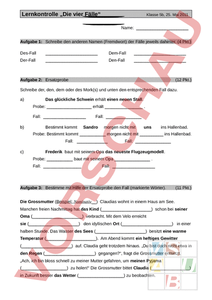Lernkontrolle „Die vier Fälle Klasse 5b, 25. Mai 2011 Name: Aufgabe 1: Schreibe den anderen Namen (Fremdwort) der Fälle jeweils dahinter. (4 Pkt.) Des-Fall Dem-Fall Der-Fall Den-Fall Aufgabe 2: Ersatzprobe (12 Pkt.) Schreibe der, den, dem oder des Mork(s) und unten den entsprechenden Fall dazu. a) Das glückliche Schwein erhält einen neuen Stall. Probe: erhält Fall: b) Bestimmt kommt Fall: Sandro morgen nicht mit uns ins Hallenbad. Probe: Bestimmt kommt morgen nicht mit ins Hallenbad. Fall: c) Fall: Frederik baut mit seinem Opa das neueste Flugzeugmodell. Probe: baut mit seinem Opa Fall: Fall: Aufgabe 3: Bestimme mit Hilfe der Ersatzprobe den Fall (markierte Wörter). (11 Pkt.) Die Grossmutter (Beispiel: Nominativ) Claudias wohnt in einem Haus am See. Manchen freien Nachmittag hat das Kind (_) schon bei seiner Oma (_) verbracht. Mit dem Velo erreicht sie (_) den idyllischen Ort (_) in einer halben Stunde. Das Wasser des Sees (_) besitzt eine warme Temperatur (_). Am Abend kommt ein heftiges Gewitter (_) auf. Claudia geht trotzdem hinaus. „Du bist doch nicht etwa in den Regen (_) gegangen?, fragt die Grossmutter entsetzt. „Ach, ich bin bloss schnell zu meiner Mutter gefahren, um meinen Pyjama (_) zu holen! Die Grossmutter bittet Claudia () in Zukunft besser das Wetter (_) zu beobachten. Aufgabe 4: Setze die Wörter in den Klammern in den richtigen Fall. (5 Pkt.) (Tollwütige Füchse)TollwütigenFüchsen_ muss man aus (der Weg) demWeg_ gehen. Das Gebell (ein nervöser Jagdhund) schreckte das äsende Wild auf; mit (weite Sprünge) flohen die Rehe in den Wald. Die meisten Greifvögel schätzen Obstbäume, von (die) aus sie nach (eine fette Beute) Ausschau halten können. Da ist (ein Dachs)! In freier Laufbahn hat Barbara noch nie (ein solcher) gesehen. Die Zugvögel, die aus (wärmere Gebiete) zu uns zurückkehren, machen an (kalte Frühlingstage) oft noch harte Zeiten durch. Das Kreischen (eine Motorsäge) übertönt jäh das lebhafte Gezwitscher (die Singvögel) Aufgabe 6: Ergänze die richtigen Endungen. Es gibt auch leere Lücken. (10 Pkt.) Achtung: Alle Tiere müssen in der Einzahl stehen! Ein Leopard habe ich mir anders vorgestellt. Träge sitzt d Eisbär in seiner Käfigecke Der Wärter wirft ein Tiger mehrere Fleischstücke zu. Weisst du, dass die Antarktis die Heimat d Pinguin ist? D Elefant hat man wegen sei imposant Stosszahn stellenweise fast ausgerottet. Jetzt hat du d Kamel. mit d. Dromedar verwechselt. Das Okapi kann im Gegensatz zu ein Giraffe im Regenwald leben. Dies wendig Braunbär könnte man noch lange zusehen. Max. Punkte: 42 Note: Klasse: Erreichte Punkte: . Unterschrift der Eltern: .