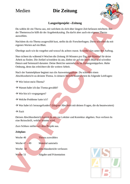 Medien Die Zeitung Langzeitprojekt –Zeitung Du wählst dir ein Thema aus, mit welchem du dich über längere Zeit befassen möchtest. Bei der Themensuche hilft dir der Angebotskatalog. Du darfst aber auch ein eigenes Thema auswählen. Nachdem du ein Thema ausgewählt hast, stellst du dir Forscherfragen. Diese schreibst du mit eigenen Worten auf ein Blatt. Überlege auch wie du vorgehst und worauf du achten musst. Schreibe dies unter den Auftrag. Nun sichtest du während 4 Wochen die Zeitung 10 Minuten pro Tag, um Material für deine Arbeit zu finden. Die Artikel schneidest du aus, klebst sie auf ein leeres Blatt und schreibst Datum und Seitenzahl darunter. Deine Berichte sammelst du im Zeitungsmäppchen. Halte Ordnung, denn das erleichtert dir die weitere Arbeit. Nach der Sammelphase beginnt nun die Auswertungsphase. Du schreibst einen Abschlussbericht zu deinem Thema. In deinem Bericht beantwortest du folgende Leitfragen: Wie heisst mein Thema? Warum habe ich das Thema gewählt? Wie bin ich vorgegangen? Welche Probleme hatte ich? Was habe ich herausgefunden? (längster Abschnitt mit deinen Fragen, die du beantwortest) Fazit Deinen Abschlussbericht kannst du mir zur Lektüre und Korrektur abgeben. Nun verfasst du eine Reinschrift, welche benotet wird. Zum Schluss stellen wir dein Projekt aus. Zeitplan: Woche 46 Thema auswählen Woche 47 – 49 Material sammeln Woche 50 Abschlussbericht verfassen Woche 51 Abgabe und Präsentation Medien Die Zeitung Vorgaben für den Abschlusstext: Du schreibst deinen Abschlusstext auf dem Computer. Schriftart: Arial Schriftgrösse: Titel 16 und fett Text 14 Länge: abgeben: 1-2 Seiten Text, alle ausgeschnittenen Artikel mit Notizen Abgabedatum: 18. Dezember 2012