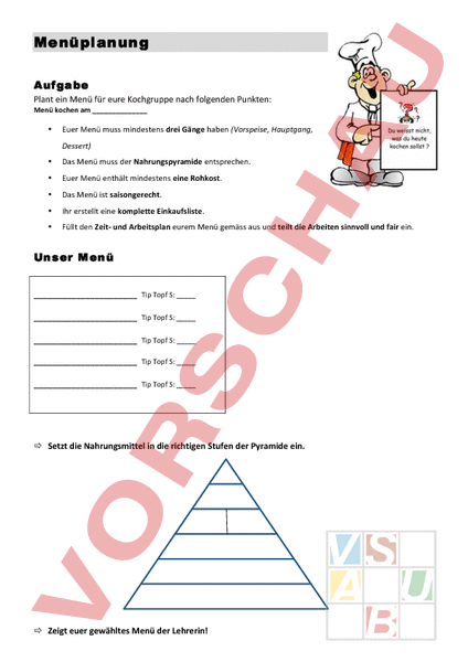Menüplanung Aufgabe Plant ein Menü für eure Kochgruppe nach folgenden Punkten: Menü kochen am • Euer Menü muss mindestens drei Gänge haben (Vorspeise, Hauptgang, Dessert) • Das Menü muss der Nahrungspyramide entsprechen. • Euer Menü enthält mindestens eine Rohkost. • Das Menü ist saisongerecht. • Ihr erstellt eine komplette Einkaufsliste. • Füllt den Zeit-‐ und Arbeitsplan eurem Menü gemäss aus und teilt die Arbeiten sinnvoll und fair ein. Unser Menü Tip Topf S: _ Tip Topf S: _ Tip Topf S: _ Tip Topf S: _ Tip Topf S: _ ð Setzt die Nahrungsmittel in die richtigen Stufen der Pyramide ein. ð Zeigt euer gewähltes Menü der Lehrerin! Einkaufsliste Mengenangaben nicht vergessen! Früchte / Milch / Getreide-‐ Fleisch / Eier Verschiedenes Gemüse Milchprodukte produkte Nicht einkaufen müsst ihr: Tee, Gewürze, Essig / Öl, Zucker / Mehl Arbeitsplanung Lies im Tiptopf die Seiten 14 und 15 gut durch. Notiere dir Wichtiges, das du zur Zeit-‐ und Arbeitsplanung noch nicht gewusst hast. Was gibt es alles zu bedenken, damit ein ganzes Menü pünktlich auf dem Tisch steht und weder verkocht noch roh ist? ü ü ü ü ü ü ü ü Fülle nun den vorgegebenen Arbeitsplan mit deinen Gruppenmitgliedern so aus, dass ihr alle genügend zu tun habt und in der vorgegebenen Zeit fertig werdet.