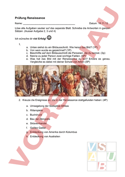 Prüfung Renaissance Name: Datum: 16.11.12 Löse alle Aufgaben sauber auf das separate Blatt. Schreibe die Antworten in ganzen Sätzen. (Ausser Aufgabe 2, 3 und 4) Ich wünsche dir viel Erfolg! J 1. a. b. c. d. e. Unten siehst du ein Bildausschnitt. Wie heisst das Bild? (1P) Von wem wurde es gezeichnet? (1P) Beschrifte auf dem Bildausschnitt die Personen, die du kennst. (3p) Nenne zu jeder Person zwei wichtige Fakten. (6P) Was hat das Bild mit der Renaissance zu tun? Erkläre es genau. Vergleiche es dabei mit deiner Schule von Athen (5P) 2. Kreuze die Ereignisse an, die in der Renaissance stattgefunden haben: (4P) a. Umsegelung der Südspitze Afrikas b. Ritterspiele c. Buchdruck d. Bau der Akropolis e. Sklavenhandel f. Galileo Galilei g. Entdeckung von Amerika durch Kolumbus h. Entdeckung von Australien 3. Fülle die Lücken aus: (5P) Die berühmteste Familie im 15. Jahrhunder in Florenz hiess. Sie handelten mit Waren darunter waren, und . Um den Handel einfacher zu machen gründeten sie eine der ersten auf der Welt. Damit entstand ein neues Gewerbe, der Geldhandel. Die vergaben sogar Darlehen an den. Die Familie wurde dadurch sehr reich und in der ganzen Welt berühmt. Um ihre Macht nach aussen zu zeigen, förderten sie die. Doch 1500 ging die kulturelle Blütezeit zu ende und eine trat ein. Vor allem die Wollstoffherstellung aus der wichtigen Textilbranchemussten geschlossen werden. Ausserdem verarbeiteten die aus England die Wolle nun billiger. England, Spanien und Frankreich wurden wegen der Entdeckung von wirtschaftlich bedeutender und somit mächtiger. 4. Schreibe hinter jeden Satz, wer das erfunden oder gesagt hat. Folgende Personen stehen zur Auswahl: Gutenberg, Vesal, Kopernikus, Kepler und Galilei (5P) a. Er erbrachte den Beweis, dass die Erde und die anderen Planeten um die Sonne kreisen. b. Er entdeckte die Jupitermonde und sagte, dass das Universum unendlich sei. c. Er hat den Buchdruck in Europa erfunden d. Er berechnete die Umlaufbahnen der Planeten um die Sonne. Damit verhalf er der neuen Astronomie zu einem Durchbruch. e. Er forderte eine Erneuerung des Medizinstudiums. Er verlangte, dass man Menschen sezierte um Erkenntnisse vom Körper zu bekommen. 5. Erkläre was ein heliozentrisches Weltbild ist. Wie unterscheidet es sich von dem Weltbild aus dem Mittelalter? (3P) 6. Wie hat die Kirche auf das neue Weltbild reagiert und wieso? (3P) 7. Wie hatte man im Mittelalter Bücher hergestellt? (2P) 8. Wieso war der neue Buchdruck besser? (2P) Zusatzaufgabe: 9. Das Wort Renaissance bedeutet übersetzt die Wiedergeburt. Wieso hat man dieser Epoche diesen Name gegeben? (2P)