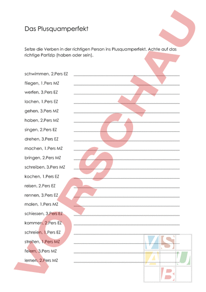 Das Plusquamperfekt Setze die Verben in der richtigen Person ins Plusquamperfekt. Achte auf das richtige Partizip (haben oder sein). schwimmen, 2.Pers EZ fliegen, 1.Pers MZ werfen, 3.Pers EZ lachen, 1.Pers EZ gehen, 3.Pers MZ haben, 2.Pers MZ singen, 2.Pers EZ drehen, 3.Pers EZ machen, 1.Pers MZ bringen, 2.Pers MZ schreiben, 3.Pers MZ kochen, 1.Pers EZ reisen, 2.Pers EZ rennen, 3.Pers EZ malen, 1.Pers MZ schiessen, 3.Pers EZ kommen, 2.Pers EZ schreien, 1.Pers EZ streiten, 1.Pers MZ feiern, 3.Pers MZ lernen, 2.Pers MZ
