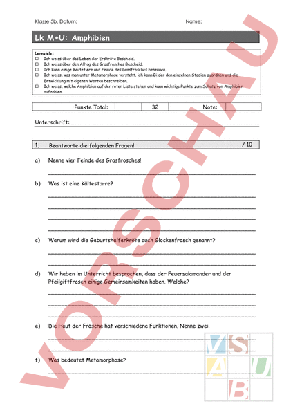 Klasse 5b, Datum: Name: Lk MU: Amphibien Lernziele: Ich weiss über das Leben der Erdkröte Bescheid. Ich weiss über den Alltag des Grasfrosches Bescheid. Ich kann einige Beutetiere und Feinde des Grasfrosches benennen. Ich weiss, was man unter Metamorphose versteht, ich kann Bilder den einzelnen Stadien zuordnen und die Entwicklung mit eigenen Worten beschreiben. Ich weiss, welche Amphibien auf der roten Liste stehen und kann wichtige Punkte zum Schutz von Amphibien aufzählen. Punkte Total: 32 Note: Unterschrift: 1. Beantworte die folgenden Fragen! a) Nenne vier Feinde des Grasfrosches! 10 b) Was ist eine Kältestarre? c) Warum wird die Geburtshelferkröte auch Glockenfrosch genannt? d) Wir haben im Unterricht besprochen, dass der Feuersalamander und der Pfeilgiftfrosch einige Gemeinsamkeiten haben. Welche? e) Die Haut der Frösche hat verschiedene Funktionen. Nenne zwei! f) Was bedeutet Metamorphose? g) Die Zahl der heranreifenden Eier beträgt beim Feuersalamander zwischen 10 und 50, beim Grasfrosch dagegen etwa 4 00. Warum ist das so? Erkläre! 2. Die Entwicklung des Grasfrosches a) Erkläre genau, was sich von Bild 3 zu Bild 4 verändert! (Wie atmet die Kaulquappe bei Bild 3 und wie atmet sie bei Bild 4?) /3 b) Was wäre der nächste Entwicklungsschritt? Zeichne Bild 5! 3. Welches Geschlecht hat diese Kröte? Woran erkennst du das? /2 4. /4 Richtig oder falsch? Kreuze die richtige Antwort an! richtig falsch Erdkröten benutzen für die Winterstarre gerne trockene Erdhöhlen. Grasfrösche sind Säugetiere und halten Winterschlaf wie die Igel. Die Hinterbeine von Kröten sind kürzer als die von Fröschen. Alle einheimischen Amphibien stehen auf der roten Liste. Kröten bewegen sich kriechend fort. Während der Verwandlung von der Kaulquappe zum Frosch wird das Tier kleiner, weil die Metamorphose viel Energie braucht. Während der Metamorphose fressen Kaulquappen bzw. Frösche nichts. Ein erwachsener Feuersalamander wird bis zu 2 cm lang. 5. Wie sieht die Geburtshelferkröte aus? Beschreibe ihren Körper ihr Aussehen mit 4 treffenden ADJEKTIVEN! (nur eine Farbe!) 6. Ordne die Aussagen den folgenden Amphibien zu! Grasfrosch Erdkröte Geburtshelferkröte Feuersalamander /2 /5 Die Eier werden im Mutterleib befruchtet. Ihre Pupillen stehen senkrecht. Sie können eine Länge von bis zu 20 cm erreichen. Sie gehören zu den Schwanzlurchen. Sie legen ihren Laich in zwei Schnüren ab und wickeln ihn um Wasserpflanzen. Ihre Haut ist relativ glatt und glänzend. Ihre Haut ist warzig und drüsenreich. Sie gehen bei Dämmerung und bei Regenwetter auf Nahrungssuche. In Gefangenschaft können sie bis zu 40 Jahre alt werden. Zur Überwinterung graben sie sich mehrere Zentimeter tief in den Schlamm kleinerer Gewässer ein. 7. Notiere 3 wichtige Punkte zum Schutz von Amphibien! /3 Lückentext! /3 • • • 8. Der Feuersalamander gehört zu den. Die Menschen glaubten früher, dass dieses Tier aus dem geboren werde. Daher gaben sie ihm den Namen Feuersalamander. Er lebt in schattigen Laub- und Mischwäldern unserer. Man findet ihn dort in Waldrandnähe, an sauberen, Bächen und in Schluchten. Die Beine werden beim Laufen bewegt. Der dient dabei zum Halten der Balance. Viel Glück!!! Ich fand diese Prüfung: r einfach r gut lösbar r anspruchsvoll r sehr schwierig Wie schätzt du deine Leistung ein? r ungenügende Leistung r genügende Leistung r gute Leistung r sehr gute Leistung