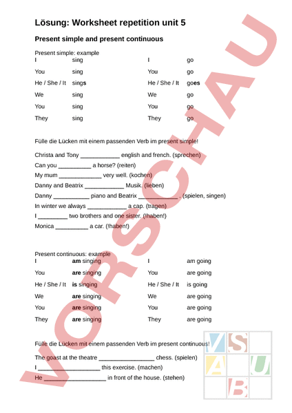 Lösung: Worksheet repetition unit 5 Present simple and present continuous Present simple: example sing go You sing You go He She It sings He She It goes We sing We go You sing You go They sing They go Fülle die Lücken mit einem passenden Verb im present simple! Christa and Tony english and french. (sprechen) Can you horse? (reiten) My mum very well. (kochen) Danny and Beatrix Musik. (lieben) Danny piano and Beatrix (spielen, singen) In winter we always cap. (tragen) two brothers and one sister. (!haben!) Monica car. (!haben!) Present continuous: example am singing am going You are singing You are going He She It is singing He She It is going We are singing We are going You are singing You are going They are singing They are going Fülle die Lücken mit einem passenden Verb im present continuous! The goast at the theatre chess. (spielen) this exercise. (machen) He in front of the house. (stehen) Lösung: Worksheet repetition unit 5 Samantha and Cristian to the cinema. (gehen) The guide to the group. (sprechen) It today. (regnen) Thomas, you really good film. (schauen) house with nice garden. (malen) Present simple or present continuous? We use the present simple to talk about routines and the present continuous to talk about what is happening now. Fülle die Lücken mit dem passenden Verb im present simple oder im present continuous! Barbara and Rosie Eminem. (mögen) We our friends every day. (telefonieren) Robbie cant answer his mobile phone because he . (fahren) Dom and Amy are in the kitchen, they lunch. (kochen) Look over there! Amy on the floor. (sitzen) Steve often up late at the weekend. (aufstehen) Sara saxophone every Saturday night. (spielen) We an english lesson now. (haben) Possessive pronouns Possessive adjectives Possessive pronouns My Mine Your Yours His/ her His/hers Our Ours Your Yours Their Theirs Lösung: Worksheet repetition unit 5 Beantworte die Fragen immer positiv! Is this Steves watch? Yes, its his. Is it Saras cap? Are these Rosies and Kierans bikes? Is this my earring? Is it your own car? Schreib hinten jeweils die Kurzform! That is our house. Its ours. This is their horse. Its my mobile phone. This is Tobis bike. Thats our dog. Its Carols guitar. Comparative adjectives Fülle die Tabelle aus! Adjective Comparative cold hotter difficult worse high wetter late more popular dry Lösung: Worksheet repetition unit 5 shorter famous easier expensive sunnier big better rainy cloudier