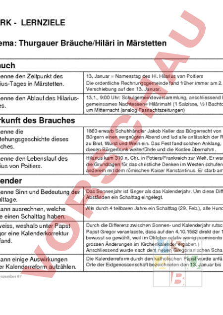 BGRK LERNZIELE Thema: Thurgauer Bräuche/Hiläri in Märstetten Brauch Ich kenne den Zeitpunkt des HilariusTages in Märstetten. 13. Januar Namenstag des Hl. Hilarius von Poitiers Die ordentliche Rechnungsgemeinde fand früher immer am 2. Januar statt. Durch die Kalenderreform erfolgte eine Verschiebung auf den 13. Januar. Ich kenne den Ablauf des Hilarius Tages. 13.1., 9:00 Uhr: Schulgemeindeversammlung, anschliessend Bürgergemeindeversammlung Holzgant gemeinsames Nachtessen Hilärimahl (1 Salzisse, Bachtobler, Mehlsuppe) Dorfzeitung mit Jahreschronik um Mitternacht (analog Fasnachtszeitungen) Herkunft des Brauches Ich kenne die Entstehungsgeschichte dieses Brauches. 1860 erwarb Schuhhändler Jakob Keller das Bürgerrecht von Märstetten. Als Zeichen seiner Freude gönnte er den Bürgern einen vergnügten Abend und lud alle anlässlich der Rechnungsgemeinde am 2. Januar (alter Kalender) zu Brot, Wurst und Wein ein. Das Fest fand solchen Anklang, dass schon im folgenden Jahr die Bürgerkasse diesen Bürgertrunk weiterführte und die Kosten übernahm. Ich kenne den Lebenslauf des Hilarius von Poitiers. Hilarius kam 310 n. Chr. in Potiers/Frankreich zur Welt. Er war einer der grossen Bischöfe des 4. Jahrhunderts, die die Grundlagen für das christliche Denken im Westen schufen. Durch seine Überzeugung geriet er in Streit unter anderem mit dem römischen Kaiser Konstantinus. Er starb am 13. Januar 367. Kalender Ich kenne Sinn und Bedeutung der Schalttage. Das Sonnenjahr ist länger als das Kalenderjahr. Um diese Differenz zu korrigieren, wird in genau berechneten Abständen ein Schalttag eingelegt. Ich kann ausrechnen, welche Jahre einen Schalttag haben. Alle durch 4 teilbaren Jahre ein Schalttag (29. Feb.), alle Hunderterjahre nicht, alle 400 ja. Ich weiss, weshalb unter Papst Gregor eine Kalenderkorrektur stattfand. Durch die Differenz zwischen Sonnen und Kalenderjahr rutschte der Jahresanfang immer mehr in den Frühling. Papst Gregor veranlasste, dass auf den 4.10.1582 direkt der 15.10.1582 folgen solle (Der Zeitpunkt wurde bewusst so gewählt, weil im Oktober relativ wenig prominente Heilige ihren Gedenktag feiern und sich so keine grossen Änderungen im Kirchenkalender ergaben.) Anschliessend wurde nach dem neuen Gregorianischen SchalttagsModell gerechnet. Ich kann einige Auswirkungen dieser Kalenderreform aufzählen. Die Kalenderreform durch den katholischen Papst wurde anfänglich nicht von allen anerkannt. Die reformierten Orte der Eidgenossenschaft bezeichneten den 13. Januar bis 1700 noch als „alten Silvester. (Silvesterkläuse von BOE Dezember 07 Urnäsch, Bürgertrunk von Märstetten, Basler Fasnacht eine Woche später, ) BOE Dezember 07