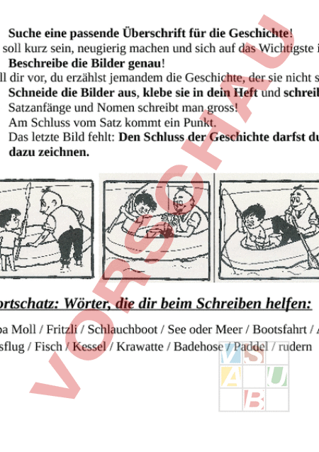 Suche eine passende Überschrift für die Geschichte! Sie soll kurz sein, neugierig machen und sich auf das Wichtigste in der Geschichte beziehen. • Beschreibe die Bilder genau! Stell dir vor, du erzählst jemandem die Geschichte, der sie nicht sieht. • Schneide die Bilder aus, klebe sie in dein Heft und schreibe ganze Sätze dazu. • Satzanfänge und Nomen schreibt man gross! • Am Schluss vom Satz kommt ein Punkt. • Das letzte Bild fehlt: Den Schluss der Geschichte darfst du selber erfinden und das Bild dazu zeichnen. • Wortschatz: Wörter, die dir beim Schreiben helfen: Papa Moll Fritzli Schlauchboot See oder Meer Bootsfahrt Angelrute Köder Haken Ausflug Fisch Kessel Krawatte Badehose Paddel rudern