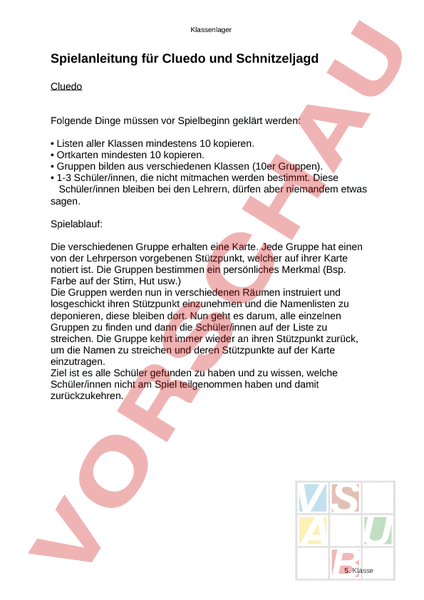 Klassenlager Spielanleitung für Cluedo und Schnitzeljagd Cluedo Folgende Dinge müssen vor Spielbeginn geklärt werden: • Listen aller Klassen mindestens 10 kopieren. • Ortkarten mindesten 10 kopieren. • Gruppen bilden aus verschiedenen Klassen (10er Gruppen). • 1-3 Schüler/innen, die nicht mitmachen werden bestimmt. Diese Schüler/innen bleiben bei den Lehrern, dürfen aber niemandem etwas sagen. Spielablauf: Die verschiedenen Gruppe erhalten eine Karte. Jede Gruppe hat einen von der Lehrperson vorgebenen Stützpunkt, welcher auf ihrer Karte notiert ist. Die Gruppen bestimmen ein persönliches Merkmal (Bsp. Farbe auf der Stirn, Hut usw.) Die Gruppen werden nun in verschiedenen Räumen instruiert und losgeschickt ihren Stützpunkt einzunehmen und die Namenlisten zu deponieren, diese bleiben dort. Nun geht es darum, alle einzelnen Gruppen zu finden und dann die Schüler/innen auf der Liste zu streichen. Die Gruppe kehrt immer wieder an ihren Stützpunkt zurück, um die Namen zu streichen und deren Stützpunkte auf der Karte einzutragen. Ziel ist es alle Schüler gefunden zu haben und zu wissen, welche Schüler/innen nicht am Spiel teilgenommen haben und damit zurückzukehren. 5. Klasse Klassenlager Schnitzeljagd Folgende Dinge müssen vor Spielbeginn geklärt werden: • Gruppen à 5 Schüler/innen bilden. • Ortkarten kopieren (mindestens 20) • Schüler bestimmen einen Schatz, welchen die anderen finden müssen. Spielablauf: Es werden immer 2 Gruppen bestimmt, die miteinander das Spiel bestreiten. Die erste Gruppe bekommt eine Karte, wo der Standort des Schatzes eingezeichnet ist. Die Gruppe nimmt ihren Schatz und markiert mit ihrer Kreidenfarbe Pfeile auf den Boden, um den weg zum Schatz zu kennzeichnen. In fünfminütigem Abstand zur 1.Gruppe wird die 2. Gruppe losgeschickt. Sie müssen die erste Gruppe einholen versuchen und den Schatz finden. Wenn die erste Gruppe den Schatz platziert hat, kehrt sie wieder zum Lagerhaus zurück. Ziel ist es, die zweite Gruppe mit den Pfeilen zum Schatz zu führen (mit Umwegen) und am Zielpunkt nach dem Schatz suchen zu lassen. Nachher wird gewechselt. 5. Klasse