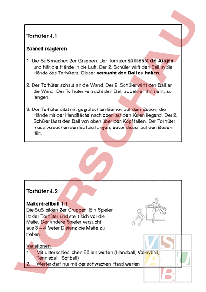 Torhüter 4.1 Schnell reagieren 1. Die SuS machen 2er Gruppen. Der Torhüter schliesst die Augen und hält die Hände in die Luft. Der 2. Schüler wirft den Ball in die Hände des Torhüters. Dieser versucht den Ball zu halten. 2. Der Torhüter schaut an die Wand. Der 2. Schüler wirft den Ball an die Wand. Der Torhüter versucht den Ball, sobald er ihn sieht, zu fangen. 3. Der Torhüter sitzt mit gegrätschten Beinen auf dem Boden, die Hände mit der Handfläche nach oben auf den Knien liegend. Der 2. Schüler lässt den Ball von oben über den Kopf fallen. Der Torhüter muss versuchen den Ball zu fangen, bevor dieser auf den Boden fällt. Torhüter 4.2 Mattentreffball 1:1 Die SuS bilden 2er Gruppen. Ein Spieler ist der Torhüter und stellt sich vor die Matte. Der andere Spieler versucht aus 3 – 4 Meter Distanz die Matte zu treffen. Variationen: 1. Mit unterschiedlichen Bällen werfen (Handball, Volleyball, Tennisball, Softball) 2. Werfer darf nur mit der schwachen Hand werfen 3. Torhüter darf nur die Beine zum verteidigen brauchen Torhüter 4.3 Burgwächter Die SuS werden in 5er/6er Gruppen eingeteilt. Auf einen Kasten wird ein Medizinball gelegt. Die Spieler versuchen, diesen vom Kasten zu schiessen. Der Torhüter bewacht den Medizinball und wehrt die Schüsse mit Händen und Füssen ab. Die Werfer stehen hinter einer Linie und dürfen diese nicht übertreten. Torhüter 4.4 Tigerball Die SuS werden in Gruppen eingeteilt und stellen sich um einen Kreis oder Viereck auf. Ein SoS stellt sich in das Feld rein. Die Aussenspieler spielen sich einen Ball via Boden zu. Der Torhüter versucht, den Ball mit dem Fuss zu stoppen. Variation: 1. Im Mittelpunkt des Feldes liegen einige Medizinbälle. Die Spieler versuchen die Medizinbälle zu treffen, der Torhüter wehrt ab. 2. Mit mehr als 1 Ball spielen.