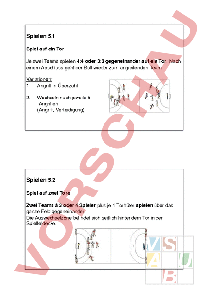 Spielen 5.1 Spiel auf ein Tor Je zwei Teams spielen 4:4 oder 3:3 gegeneinander auf ein Tor. Nach einem Abschluss geht der Ball wieder zum angreifenden Team. Variationen: 1. Angriff in Überzahl 2. Wechseln nach jeweils 5 Angriffen (Angriff, Verteidigung) Spielen 5.2 Spiel auf zwei Tore Zwei Teams à 3 oder 4 Spieler plus je 1 Torhüter spielen über das ganze Feld gegeneinander. Die Auswechselzone befindet sich seitlich hinter dem Tor in der Spielfeldecke. Spielen 5.3 Jeder Wurf zählt Zwei Teams spielen à 3 oder 4 Spieler plus je 1 Torhüter über das ganze Feld gegeneinander. Hält der Torhüter den Ball, zählt dies wie ein erzieltes Tor. Variationen: 1. Am Schluss wird die Anzahl erzielter Tore mit der Anzahl der verschiedenen Torschützen multipliziert. Beispiel: Endstand 6 8 Team 6 Tore 4 Torschützen 24 Team 8 Tore 2 Torschützen 16 Endresultat: 24 16 Spielen 5.4 2 3:3 Jedes Team besteht aus einem Torhüter und 6 Feldspielern. Die Feldspieler verteilen sich so, dass sich je 3 Spieler in jeder Spielfeldhälfte befinden. In jeder Hälfte befinden sich also jeweils 3 Angreifer und 3 Verteidiger. Die Feldspieler dürfen den Ball über die Mittellinie spielen, selber ihre Hälfte aber nicht verlassen. Nach Abschluss auf das Tor bringt der Torhüter den Ball wieder ins Spiel, indem er einen Mitspieler auf der Spielhälfte anspielt. Spieler regelmässig auswechseln und auch in beiden Spielfeldhälften zum Einsatz kommen lassen.