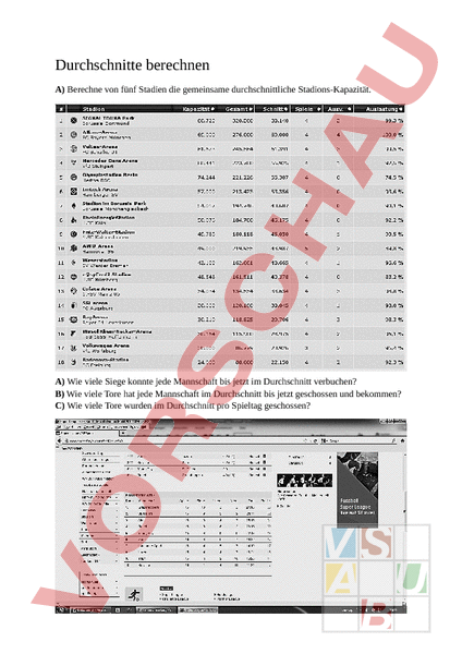 Durchschnitte berechnen A) Berechne von fünf Stadien die gemeinsame durchschnittliche Stadions-Kapazität. A) Wie viele Siege konnte jede Mannschaft bis jetzt im Durchschnitt verbuchen? B) Wie viele Tore hat jede Mannschaft im Durchschnitt bis jetzt geschossen und bekommen? C) Wie viele Tore wurden im Durchschnitt pro Spieltag geschossen?