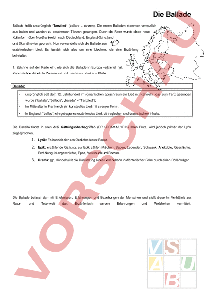 Die Ballade Ballade heißt ursprünglich Tanzlied (ballare tanzen). Die ersten Balladen stammen vermutlich aus Italien und wurden zu bestimmten Tänzen gesungen. Durch die Ritter wurde diese neue Kulturform über Nordfrankreich nach Deutschland, EnglandSchottland und Skandinavien gebracht. Nun verwandelte sich die Ballade zum erzählerischen Lied. Es handelt sich also um eine Liedform, die eine Erzählung beinhaltet. 1. Zeichne auf der Karte ein, wie sich die Ballade in Europa verbreitet hat. Kennzeichne dabei die Zentren rot und mache von dort aus Pfeile! Ballade: ursprünglich seit dem 12. Jahrhundert im romanischen Sprachraum ein Lied mit Kehrreim, das zum Tanz gesungen wurde (ballata, ballada, „balada Tanzlied); im Mittelalter in Frankreich ein kunstvolles Lied mit strenger Form; in England (ballad) ein getragenes erzählendes Lied, oft tragischen und dramatischen Inhalts. Die Ballade findet in allen drei Gattungsoberbegriffen (EPIK/DRAMA/LYRIK) ihren Platz, wird jedoch primär der Lyrik zugesprochen. 1. Lyrik: Es handelt sich um Gedichte fester Bauart. 2. Epik: erzählende Gattung, zur Epik zählen Märchen, Sagen, Legenden, Schwank, Anekdote, Geschichte, Erzählung, Kurzgeschichte, Epos, Volksbuch und Roman. 3. Drama: (gr. Handeln) ist die Darstellung eines Geschehens in dichterischer Form durch einen Rollenträger Die Ballade befasst sich mit Erlebnissen, Erfahrungen und Beziehungen der Menschen und stellt diese im Verhältnis zur Natur und Totenwelt dar. Erzählerisch werden Erfahrungen und Weisheiten vermittelt. KIT: Entwirf ein Blatt, das die wichtigsten Daten des Autors zeigt: a. Name des Autors (Bild) b. Lebenslauf in Stichworten c. Balladen, die wir kennenlernen werden (Linien ziehen) d. weitere Werke (die du kennst) BSP. LYRIK Johann Wolfgang von Goethe Lebenslauf • • 28. August 1749 in Frankfurt am Main † 22. März 1832 in Weimar Bedeutendster deutscher Dichter Verfasser von Dramen, Lyrik und erzählenden Werken (in Vers und Prosa), aber auch naturwissenschaftlicher Abhandlungen • 1765 Studium der Rechte (Jurisprudenz) in Leipzig 1793/1794 Freundschaft mit Schiller Weimarer Klassik • 1806 Christiane Vulpius nach 18 Jahren Beziehung • mehrere Kinder. • 1811/12 Begegnung mit Ludwig van Beethoven • 1816 Italienische Reise • 1823 Arbeit am Faust II Werke • Götz von Berlingen, Drama (1773) • Torquato Tasso, Schauspiel (1790) • Die Leiden des jungen Werthers, Roman • Faust, Tragödie (1808) (1774/2004, Patmos) • Faust, Tragödie, 2.Teil (1833) Gedichte • Zauberlehrling • Die Braut von Korinth • Erlkönig • Heideröslein