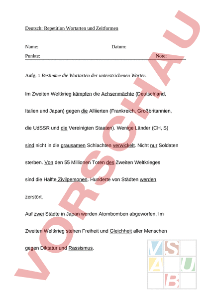 Deutsch: Repetition Wortarten und Zeitformen Name: Datum: Punkte: Note: Aufg. 1 Bestimme die Wortarten der unterstrichenen Wörter. Im Zweiten Weltkrieg kämpfen die Achsenmächte (Deutschland, Italien und Japan) gegen die Alliierten (Frankreich, Großbritannien, die UdSSR und die Vereinigten Staaten). Wenige Länder (CH, S) sind nicht in die grausamen Schlachten verwickelt. Nicht nur Soldaten sterben. Von den 55 Millionen Toten des Zweiten Weltkrieges sind die Hälfte Zivilpersonen. Hunderte von Städten werden zerstört. Auf zwei Städte in Japan werden Atombomben abgeworfen. Im Zweiten Weltkrieg stehen Freiheit und Gleichheit aller Menschen gegen Diktatur und Rassismus. Aufg. 2 In welcher Zeitform stehen die folgenden Sätze? a) Der Hund war böse gewesen. b) Ich werde der Beste sein._ c)Er isst einen Kebab. d) Er hat viel Pech gehabt._ e) Er rannte schneller als der Wind. f) Sie hat sich in ihn verliebt. Aufg. 3 Schreibe die folgenden Präsenssätze ins Perfekt um. Es ist Mittwochnachmittag. Sie trinken literweise Coca Cola. Sie essen tonnenweise Pommes Chips. Sie sind jung. Sie verbringen das Leben vor dem Computer. Sie telefonieren stundenlang.