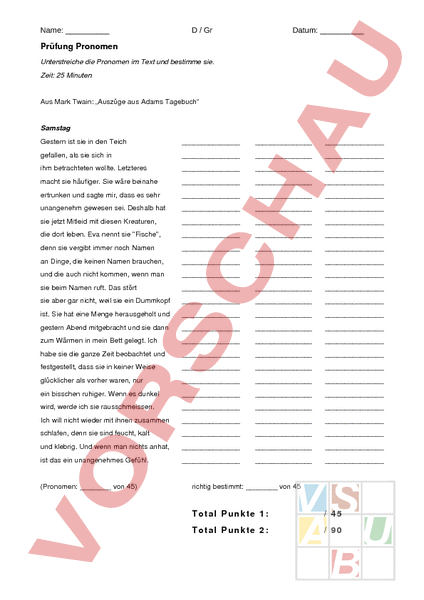 Name: / Gr Datum: Prüfung Pronomen Unterstreiche die Pronomen im Text und bestimme sie. Zeit: 25 Minuten Aus Mark Twain: „Auszüge aus Adams Tagebuch Samstag Gestern ist sie in den Teich gefallen, als sie sich in ihm betrachteten wollte. Letzteres macht sie häufiger. Sie wäre beinahe ertrunken und sagte mir, dass es sehr unangenehm gewesen sei. Deshalb hat sie jetzt Mitleid mit diesen Kreaturen, die dort leben. Eva nennt sie Fische, denn sie vergibt immer noch Namen an Dinge, die keinen Namen brauchen, und die auch nicht kommen, wenn man sie beim Namen ruft. Das stört sie aber gar nicht, weil sie ein Dummkopf ist. Sie hat eine Menge herausgeholt und gestern Abend mitgebracht und sie dann zum Wärmen in mein Bett gelegt. Ich habe sie die ganze Zeit beobachtet und festgestellt, dass sie in keiner Weise glücklicher als vorher waren, nur ein bisschen ruhiger. Wenn es dunkel wird, werde ich sie rausschmeissen. Ich will nicht wieder mit ihnen zusammen schlafen, denn sie sind feucht, kalt und klebrig. Und wenn man nichts anhat, ist das ein unangenehmes Gefühl. (Pronomen: von 45) richtig bestimmt: von 45 Total Punkte 1: 45 Total Punkte 2: 90