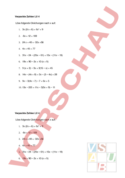 Verpackte Zahlen LU 4 Löse folgende Gleichungen nach auf: 1. 3x (2x 6) 6x2 9 2. 8x 12 108 3. 24 40 32x 56 4. 4x 45 77 5. 31x – 24 – (29x – 61) 15x – (11x – 19) 6. 19x 90 – 2x 10 (x 9) 7. 9 (x 2) – 3x 3(15 – x) 45 8. 14x – (4x 8) 3x – (3 – 4x) 28 9. 9x – 3(4x – 7) – 7 6x 5 10. 13x – 225 11x – 3(5x 9) – 11 Verpackte Zahlen LU 4 Löse folgende Gleichungen nach auf: 1. 3x (2x 6) 6x2 9 2. 8x 12 108 3. 24 40 32x 56 4. 4x 45 77 5. 31x – 24 – (29x – 61) 15x – (11x – 19) 6. 19x 90 – 2x 10 (x 9) 7. 9 (x 2) – 3x 3(15 – x) 45 8. 14x – (4x 8) 3x – (3 – 4x) 28 9. 9x – 3(4x – 7) – 7 6x 5 10. 13x – 225 11x – 3(5x 9) 11