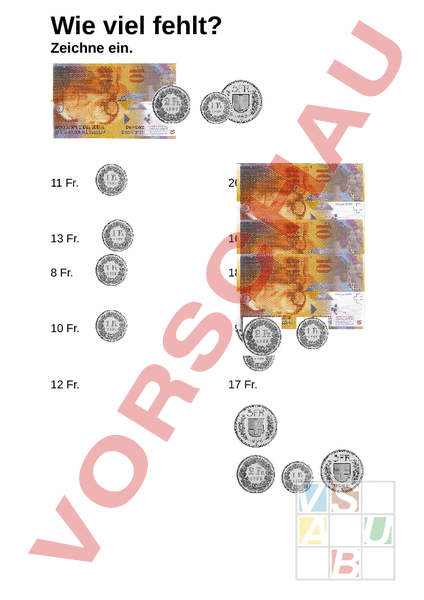 Wie viel fehlt? Zeichne ein. 11 Fr. 20 Fr. 13 Fr. 16 Fr. 8 Fr. 18 Fr. 10 Fr. 9 Fr. 12 Fr. 17 Fr.
