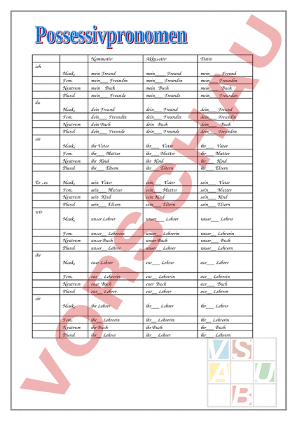 Nominativ Akkusativ Dativ Mask. Fem. Neutrum Plural mein Freund mein_ Freundin mein Buch mein_ Freunde mein Freund mein_ Freundin mein Buch mein_ Freunde mein Freund mein_ Freundin mein_ Buch mein_ Freunden Mask. Fem. Neutrum Plural dein Freund dein_ Freundin dein Buch dein_ Freunde dein_ Freund dein_ Freundin dein Buch dein_ Freunde dein_ Freund dein_ Freundin dein_ Buch dein_ Freunden Mask. Fem. Neutrum Plural ihr Vater ihr_ Mutter ihr Kind ihr_ Eltern ihr_ Vater ihr_ Mutter ihr Kind ihr_ Eltern ihr_ Vater ihr_ Mutter ihr_ Kind ihr_ Eltern Mask. Fem. Neutrum Plural sein Vater sein_ Mutter sein Kind sein_ Eltern sein_ Vater sein_ Mutter sein Kind sein_ Eltern sein_ Vater sein_ Mutter sein_ Kind sein_ Eltern Mask. unser Lehrer unser_ Lehrer unser_ Lehrer Fem. Neutrum Plural unser Lehrerin unser Buch unser Lehrer unser Lehrerin unser Buch unser Lehrer unser Lehrerin unser_ Buch unser Lehrern Mask. euer Lehrer eur_ Lehrer eur_ Lehrer Fem. Neutrum Plural eur Lehrerin euer Buch eur Lehrer eur Lehrerin euer Buch eur Lehrer eur Lehrerin eur_ Buch eur Lehrern Mask. ihr Lehrer ihr_ Lehrer ihr_ Lehrer Fem. Neutrum Plural ihr Lehrerin ihr Buch ihr Lehrer ihr Lehrerin ihr Buch ihr Lehrer ihr Lehrerin ihr_ Buch ihr_ Lehrern ich du sie Er es wir ihr sie