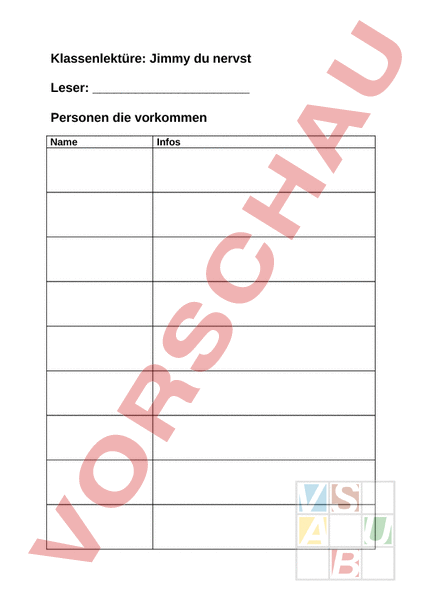 Klassenlektüre: Jimmy du nervst Leser: Personen die vorkommen Name Infos Zusammenfassung: Riesensparbüchsen S. Tod im Park S. Eine Geschichte mit einem Schweif S. Unter dem Rhabarber S. Warzen und Hexen S.