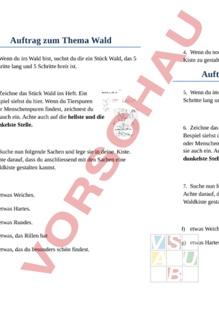 Auftrag zum Thema Wald 1. Wenn du im Wald bist, suchst du dir ein Stück Wald, das 5 Schritte lang und 5 Schritte breit ist. 4. Wenn du noch Zeit hast, kannst du damit beginnen, deine Kiste zu gestalten. Auftrag zum Thema Wald 2. Zeichne das Stück Wald ins Heft. Ein 5. Wenn du im Wald bist, suchst du dir ein Stück Wald, das 5 Bespiel siehst du hier. Wenn du Tierspuren oder Menschenspuren findest, zeichnest du sie auch ein. Achte auch auf die hellste und die dunkelste Stelle. Schritte lang und 5 Schritte breit ist. 3. Suche nun folgende Sachen und lege sie in deine Kiste. Achte darauf, dass du anschliessend mit den Sachen eine Waldkiste gestalten kannst. 6. Zeichne das Stück Wald ins Heft. Ein Bespiel siehst du hier. Wenn du Tierspuren oder Menschenspuren findest, zeichnest du sie auch ein. Achte auch auf die hellste und die dunkelste Stelle. 7. Suche nun folgende Sachen und lege sie in deine Kiste. a) etwas Weiches. Achte darauf, dass du anschliessend mit den Sachen eine Waldkiste gestalten kannst. b) etwas Hartes. c) etwas Rundes. f) etwas Weiches. d) etwas, das Rillen hat g) etwas Hartes. e) etwas, das du besonders schön findest. h) etwas Rundes. i) etwas, das Rillen hat j) etwas, das du besonders schön findest. 8. Wenn du noch Zeit hast, kannst du damit beginnen, deine Kiste zu gestalten.