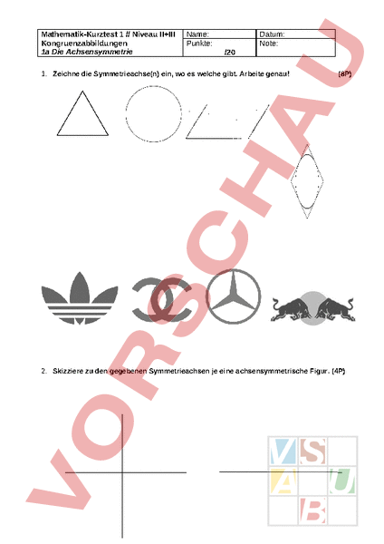 Mathematik-Kurztest 1 // Niveau IIIII Kongruenzabbildungen 1a Die Achsensymmetrie Name: Punkte: Datum: Note: /20 1. Zeichne die Symmetrieachse(n) ein, wo es welche gibt. Arbeite genau! (8P) 2. Skizziere zu den gegebenen Symmetrieachsen je eine achsensymmetrische Figur. (4P) 3. Ergänze die gegebene Figur mit einem weiteren „Gummi, so dass sie achsensymmetrisch wird. Markiere die Symmetrieachse. Benutze für die Symmetrieachse eine andere Farbe. (4P) 4. Vervollständige folgende Figur, so dass sie achsensymmetrisch wird. Zeichne die Achse(n) ein. (4P)