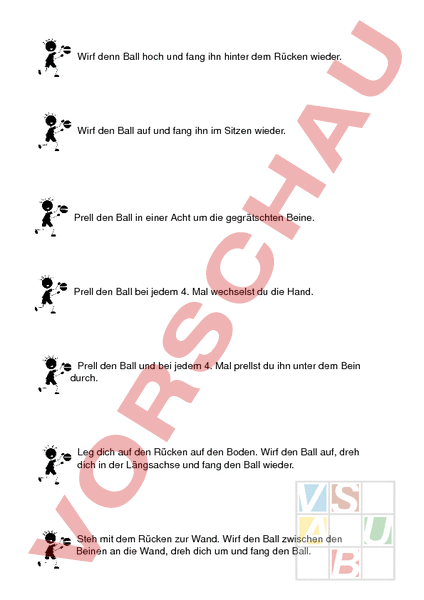 Wirf denn Ball hoch und fang ihn hinter dem Rücken wieder. Wirf den Ball auf und fang ihn im Sitzen wieder. Prell den Ball in einer Acht um die gegrätschten Beine. Prell den Ball bei jedem 4. Mal wechselst du die Hand. Prell den Ball und bei jedem 4. Mal prellst du ihn unter dem Bein durch. Leg dich auf den Rücken auf den Boden. Wirf den Ball auf, dreh dich in der Längsachse und fang den Ball wieder. Steh mit dem Rücken zur Wand. Wirf den Ball zwischen den Beinen an die Wand, dreh dich um und fang den Ball. Wirf den Ball an die Wand, mach eine ganze Drehung und fang den Ball wieder. Halte den Ball hinter dem Rücken und versuche ihn über den Kopf an die Wand. Prell den Ball zwischen gegrätschten Beinen hin und her. Prell den Ball und während dem sitzt du ab und stehst wieder auf. Erfindet selber ein Ballkunststück. Wirf den Ball mit der Hand auf und jongliere ihn auf dem Oberschenkel.