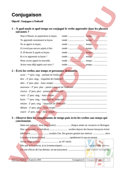 Conjugaison Objectif Conjuguer à lindicatif 1 – À quel mode et quel temps est conjugué le verbe apprendre dans les phrases suivantes Tout à lheure, tu apprendras ta leçon. mode temps . Tu apprends maintenant ta leçon. mode temps . Tu as appris ta leçon. mode temps . Il navait pas encore appris à lire. mode temps . À 19 heures il apprit sa leçon. mode temps . Et si tu apprenais ta leçon mode temps . Nous avons appris la nouvelle. mode temps . Aviez-vous déjà appris son nom mode temps . 2 – Écris les verbes aux temps et personnes demandés. avoir – 1re pers. sing. présent de lindicatif . être – 2e pers. sing. imparfait de lindicatif aller 2e pers. plur. futur simple annoncer 3e pers. plur. passé composé de lindicatif . choisir 2e pers. plur. présent de lindicatif venir 2e pers. sing. futur simple . boire 1re pers. sing. imparfait de lindicatif . refaire 2e pers. sing. imparfait de lindicatif défaire 2e pers. plur. futur simple courir 2e pers. sing. futur simple . 3 – Observe bien les compléments de temps puis écris les verbes aux temps qui conviennent. Dans son enfance, mon père (partir) . chaque année en vacances en Bretagne. Hier après-midi, le ciel (être) . sombre depuis des heures lorsquun éclair (déchirer) . soudain lair. De grosses gouttes (se mettre) alors à tomber et (transformer) rapidement la rue en torrent. Victor Hugo (vivre) . au 19e siècle. Dès que je le pourrai, je te (communiquer) ma nouvelle adresse. Un soir dhiver de lan dernier, on me (raconter) . une histoire incroyable. Jean-Luc Madoré – 24 janvier 2009 Conjugaison 8 – Conjuguer à lindicatif 1 2 Corrigé 1 – À quel mode et quel temps est conjugué le verbe apprendre dans les phrases suivantes Tout à lheure, tu apprendras ta leçon. mode indicatif. temps futur simple Tu apprends maintenant ta leçon. mode indicatif. temps présent Tu as appris ta leçon. mode indicatif. temps passé composé Il navait pas encore appris à lire. mode indicatif. temps plus-que-parfait À 19 heures il apprit sa leçon. mode indicatif. temps passé simple Et si tu apprenais ta leçon mode indicatif. temps imparfait Nous avons appris la nouvelle. mode indicatif. temps passé composé Aviez-vous déjà appris son nom mode indicatif. temps plus-que-parfait 2 – Écris les verbes aux temps et personnes demandés. avoir – 1re pers. sing. présent de lindicatif jai être – 2e pers. sing. imparfait de lindicatif tu étais aller 2e pers. plur. futur simple de lindicatif vous irez annoncer 3e pers. plur. passé composé de lindicatif ils ont annoncé choisir 2e pers. plur. présent de lindicatif vous choisissez venir 2e pers. sing. futur simple tu viendras boire 1re pers. sing. imparfait de lindicatif je buvais refaire 2e pers. sing. imparfait de lindicatif tu refaisais défaire 2e pers. plur. futur simple vous déferez courir 2e pers. sing. futur simple tu courras 3 – Observe bien les compléments de temps puis écris les verbes aux temps qui conviennent. Dans son enfance, mon père partait chaque année en vacances en Bretagne. Hier après-midi, le ciel était sombre depuis des heures lorsquun éclair déchira soudain lair. De grosses gouttes se mirent alors à tomber et transformèrent rapidement la rue en torrent. Victor Hugo vécut au 19e siècle. Dès que je le pourrai, je te communiquerai ma nouvelle adresse. Un soir dhiver de lan dernier, on me raconta une histoire incroyable. Jean-Luc Madoré – 24 janvier 2009 Conjugaison 8 – Conjuguer à lindicatif 2 2